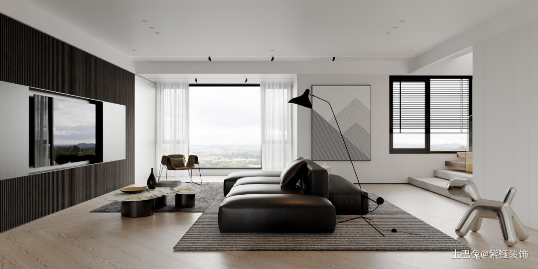 全屋整体以黑白灰为主基调,展现出一个澄净明亮的极致空间,干净利落又张力十足。天花和灯具、电视和背景墙、墙面的木