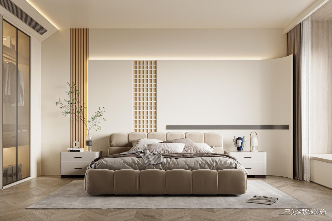 与米黄色皮质床头呼应着深褐色地板,在皎洁的天花、柜体和床品的映衬下,温润安谧如清晨滋养万物的沃土