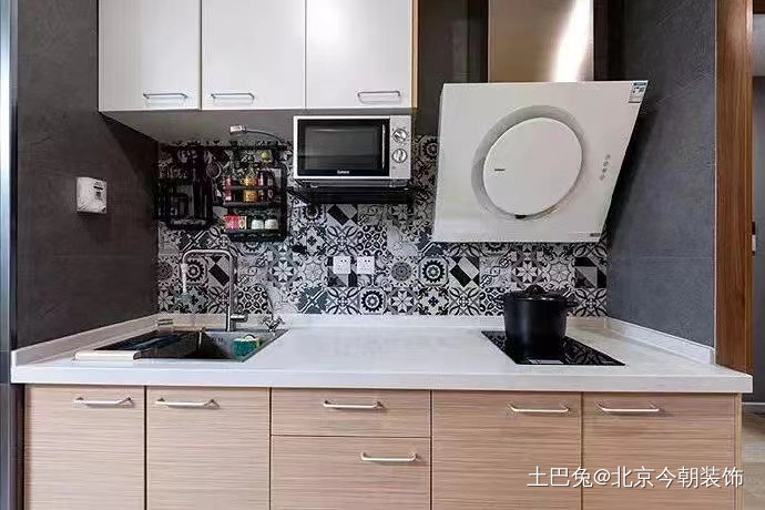 厨房的墙面采用了耐脏的花色瓷砖,这样还显得有层次感