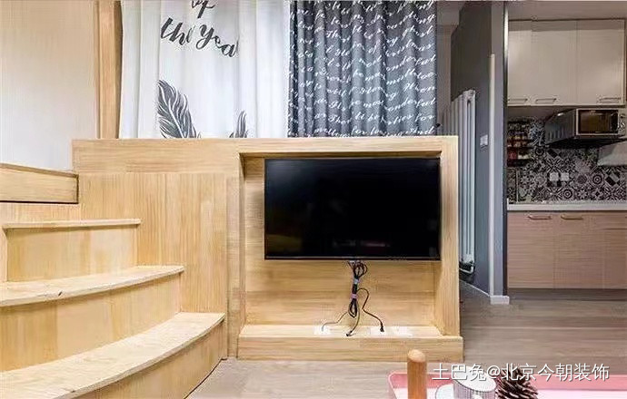进入卧室的楼梯是可以推拉的,开合面在电视左边,就像一面扇子一样,用的时候拉开,不用的时候就合上,这样可以腾出一些活动空间,看起来也没那么拥挤,这样的设计还挺有创意的。