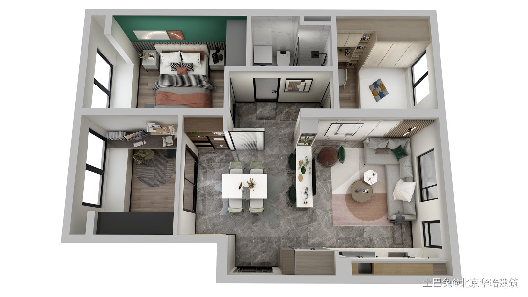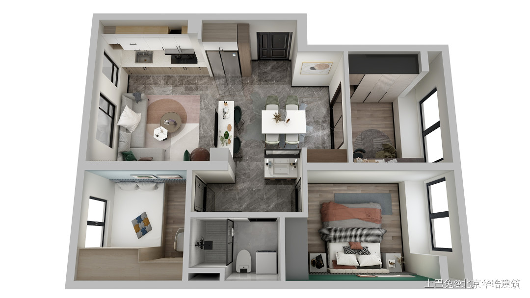 本案将传统三居设计为可变性三居,主要针对三口之家或刚需婚房这类偶有客住的需求。通过改造墙体结构,达到公共区域最大化,客餐厅、开放式厨房、半开放式多功能房,同时开放形成一体,视野开阔,空间宽敞。卫生间实现干湿分离,以保证多人同时使用。整体风格以现代为主,主要以色彩勾勒层次,融入少量金属元素,轻装修重装饰,简约而不简单。