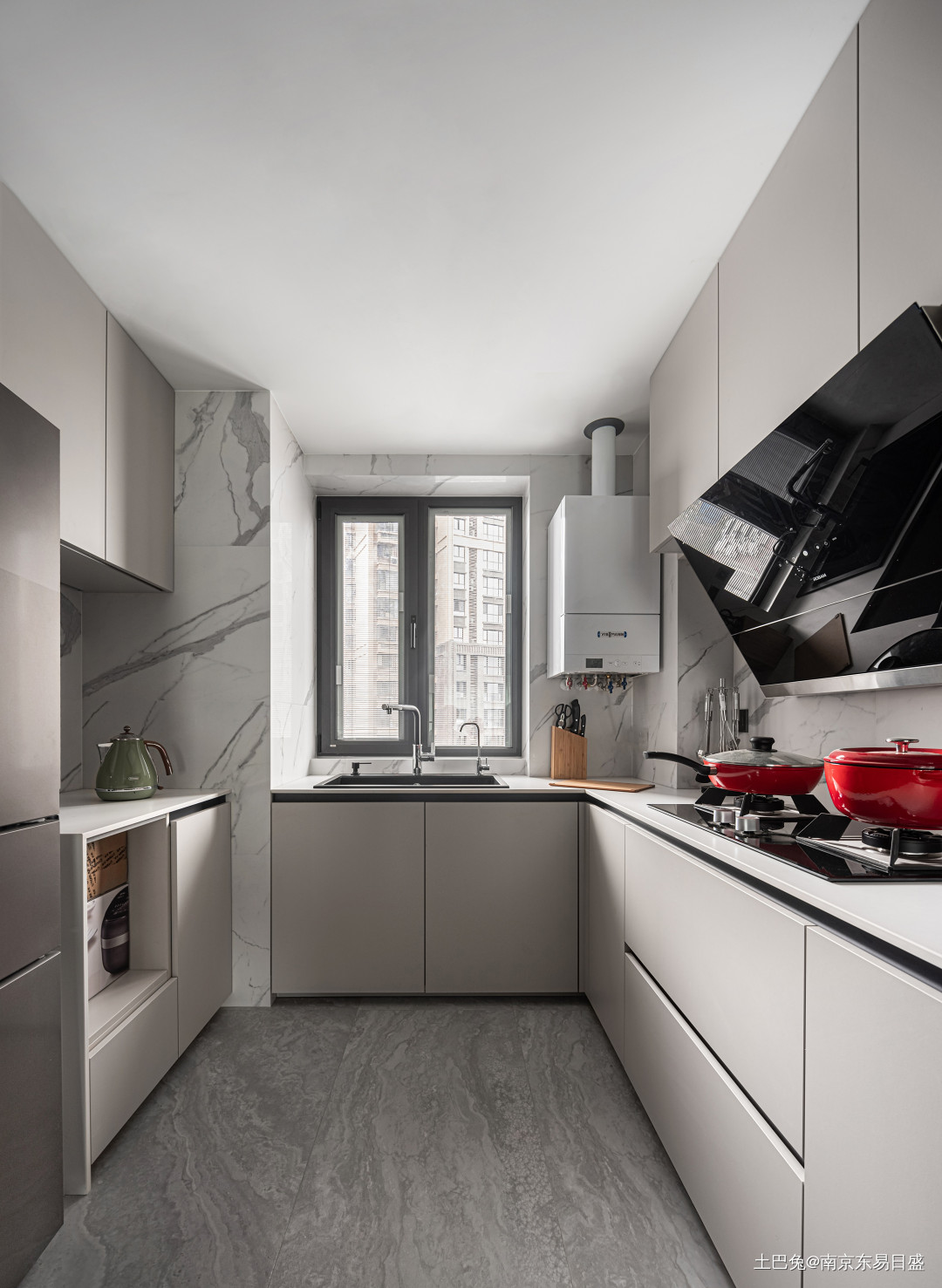 以富有纹理的大面积瓷砖作底,让厨房空间不再显得单调。U字型的厨房将油烟区与水汽区加以分隔,不仅提高做饭效率,而且大大增加了清洁的便利性。最终让设计服务于人,动线变得更加合理流畅。