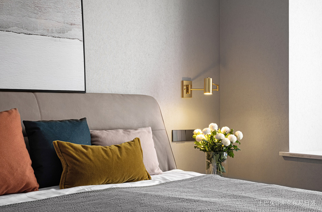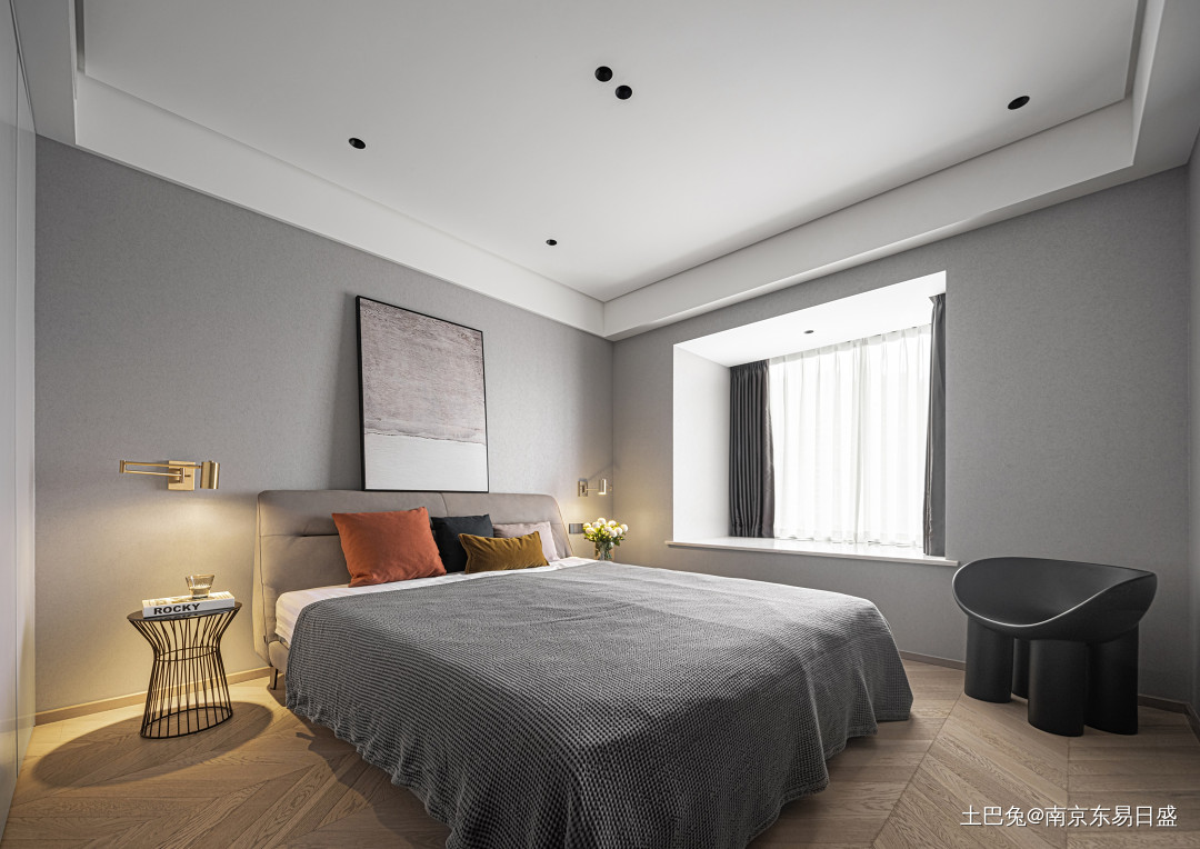 整个空间环境低调而和谐,床头仅以一副挂画及置物桌做装饰,大面积的构成元素与几何线条给空间带来时尚感。
