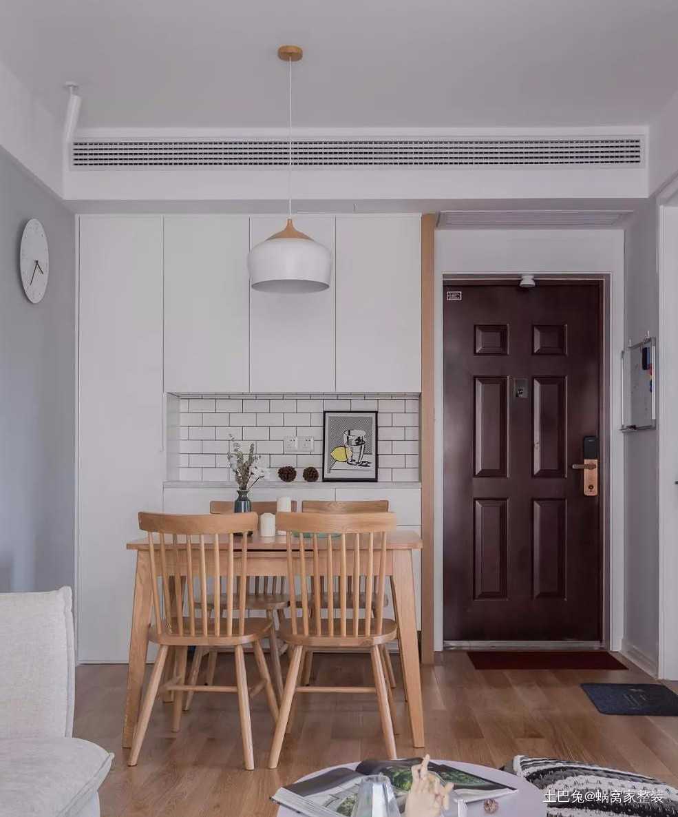 玄关结合餐厅,打造一组白色柜体,增加收纳实用功能,将空间的实际面积最大化使用