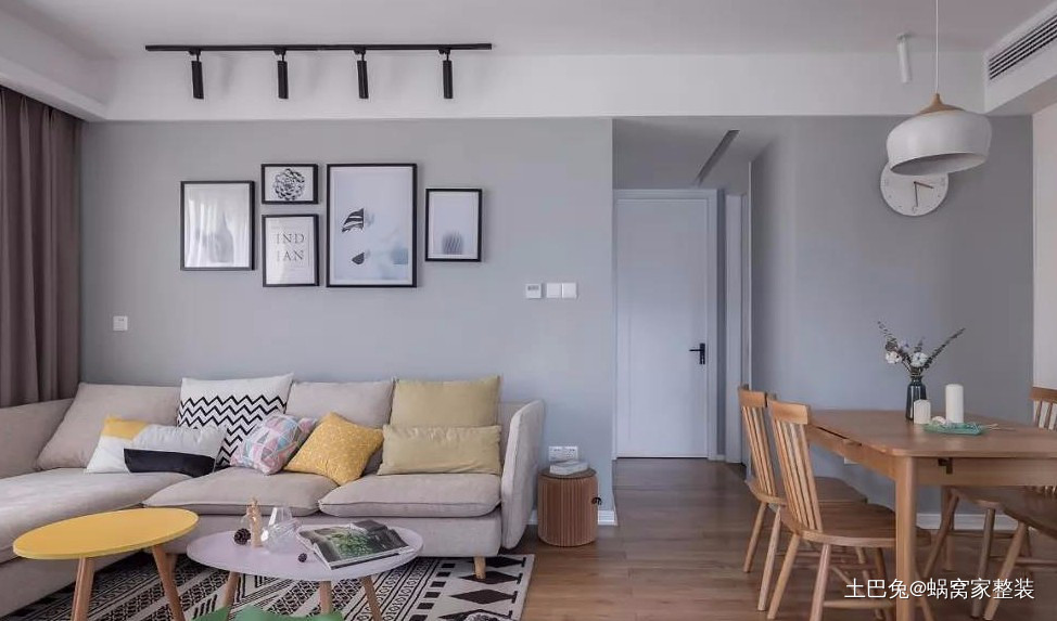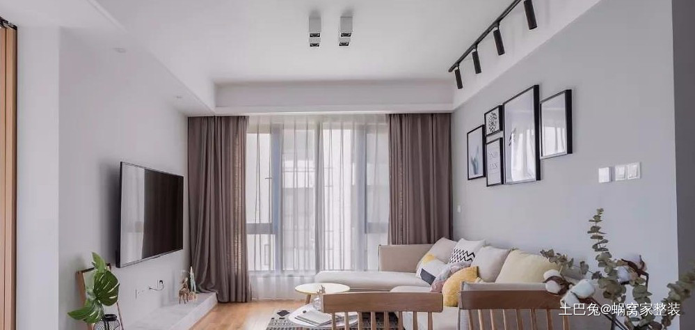客厅简洁干净舒服,顶面无大灯设计采用明装射灯和轨道灯来完成整体照明和局部照明