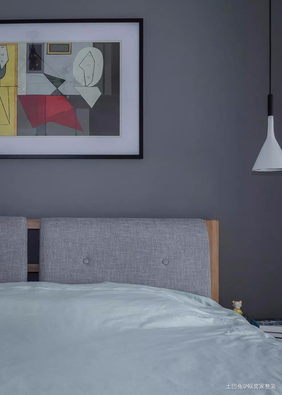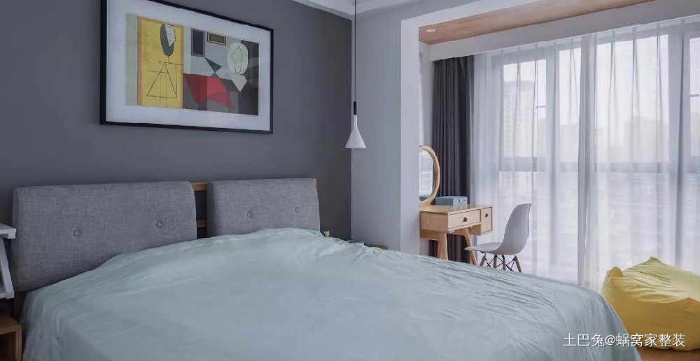 床头背景采用高级灰,床品延续整体色调,装饰画采用撞色,冷暖配合