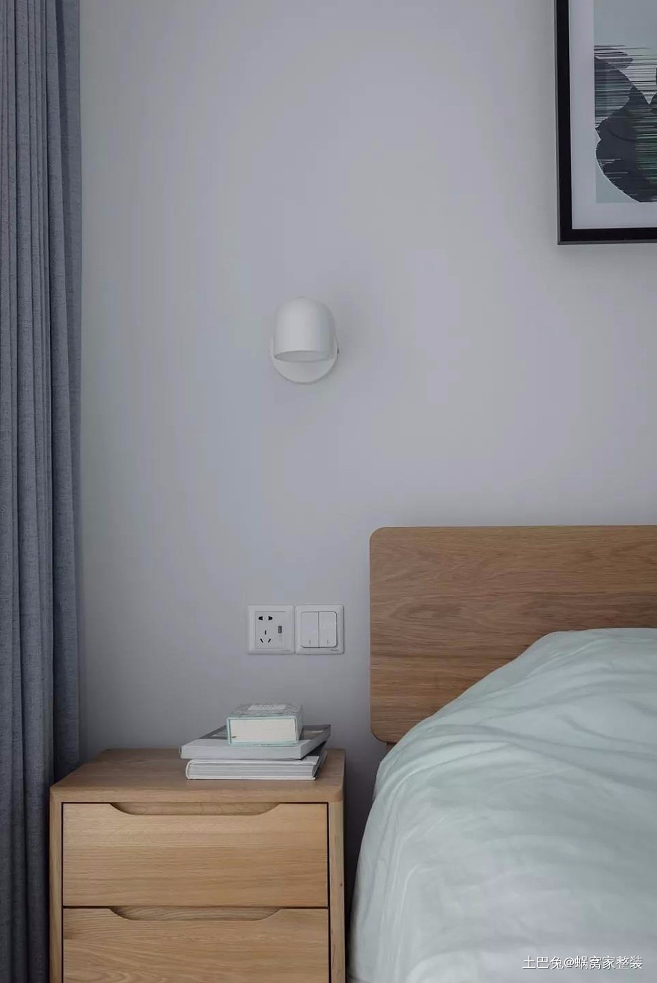 次卧,选择原木色表现出材质的独特肌理,朴实的黑色边框画幅,造型简洁的灯具互相搭配,干净素雅