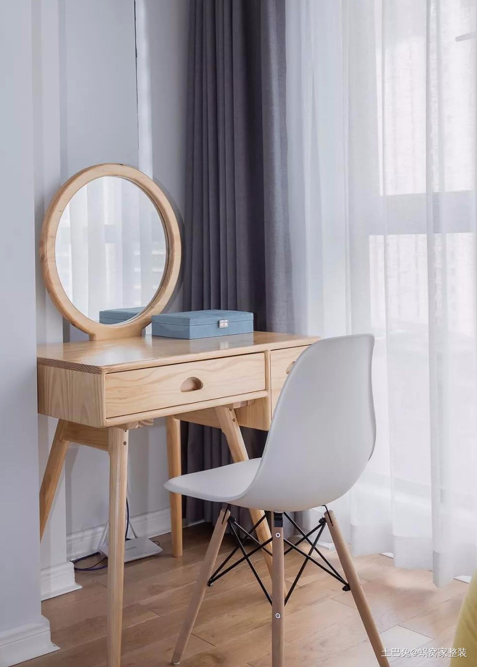 主卧纳入阳台,打造女主的梳妆区域,纯原木色的梳妆台造型可爱