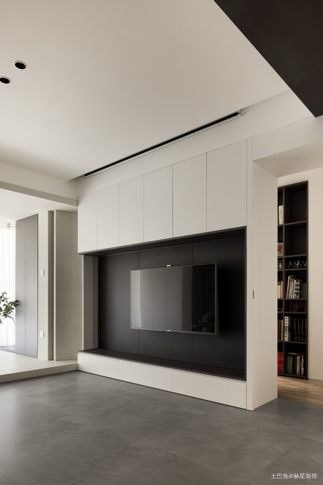 电视墙上做了大量收纳柜,顶上放置了投影幕布,电视和投影可以同时拥有。