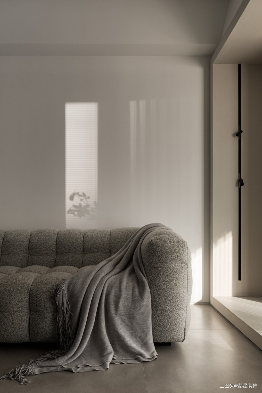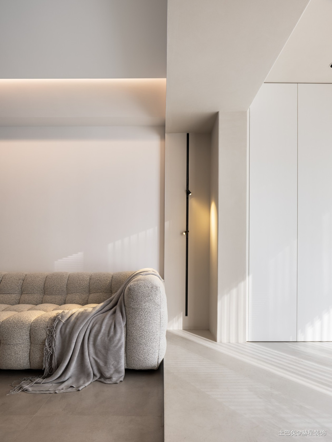 沙发,也是阅读的好地方。灯光一改传统的落地灯,选择在墙上,竖向安装轨磁吸道射灯,喜欢怎么照射,随意调整。