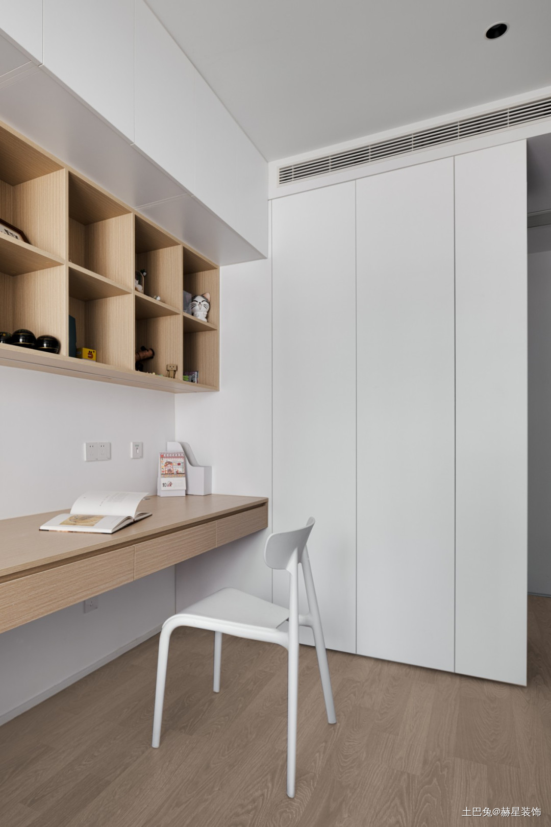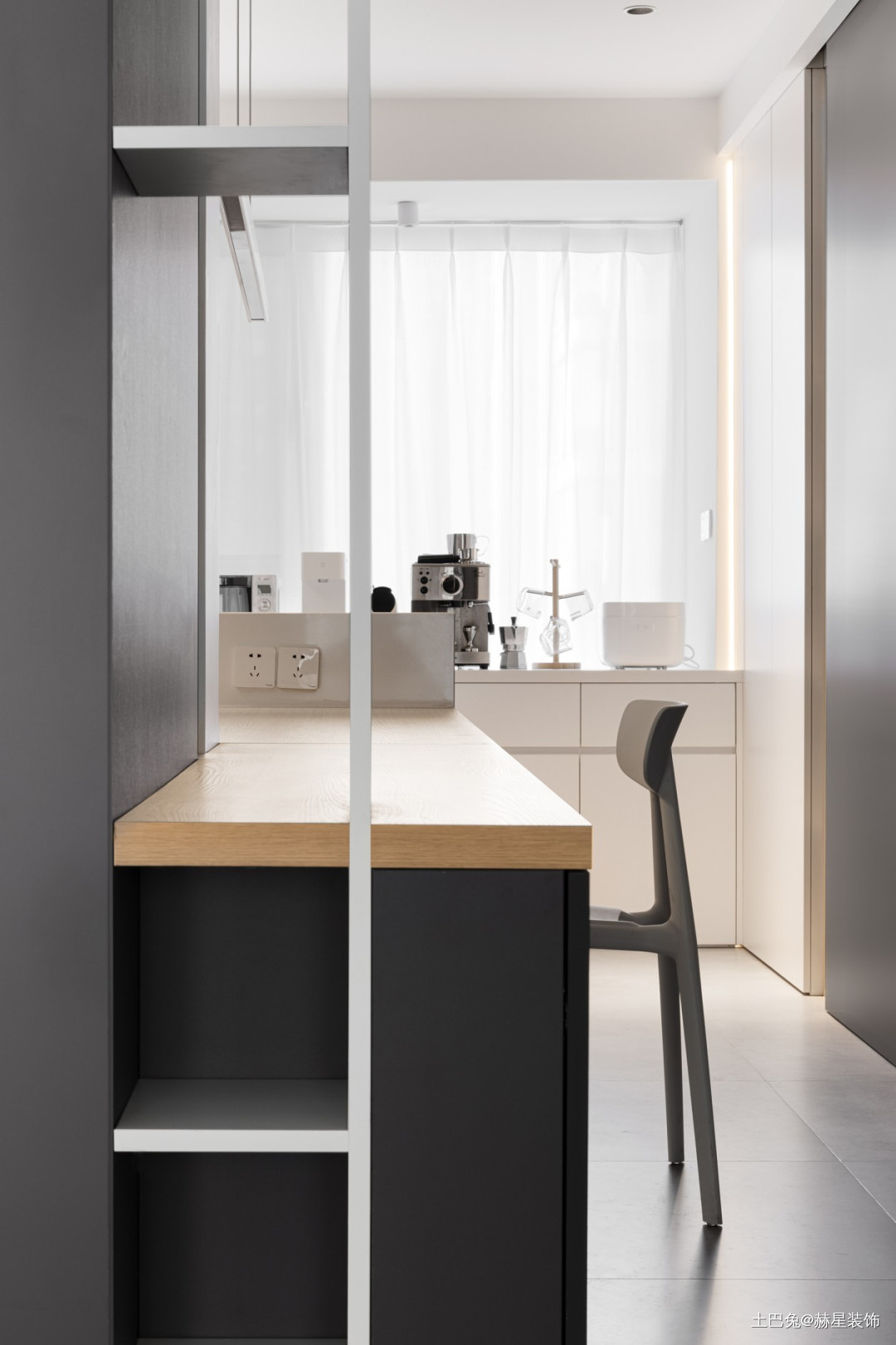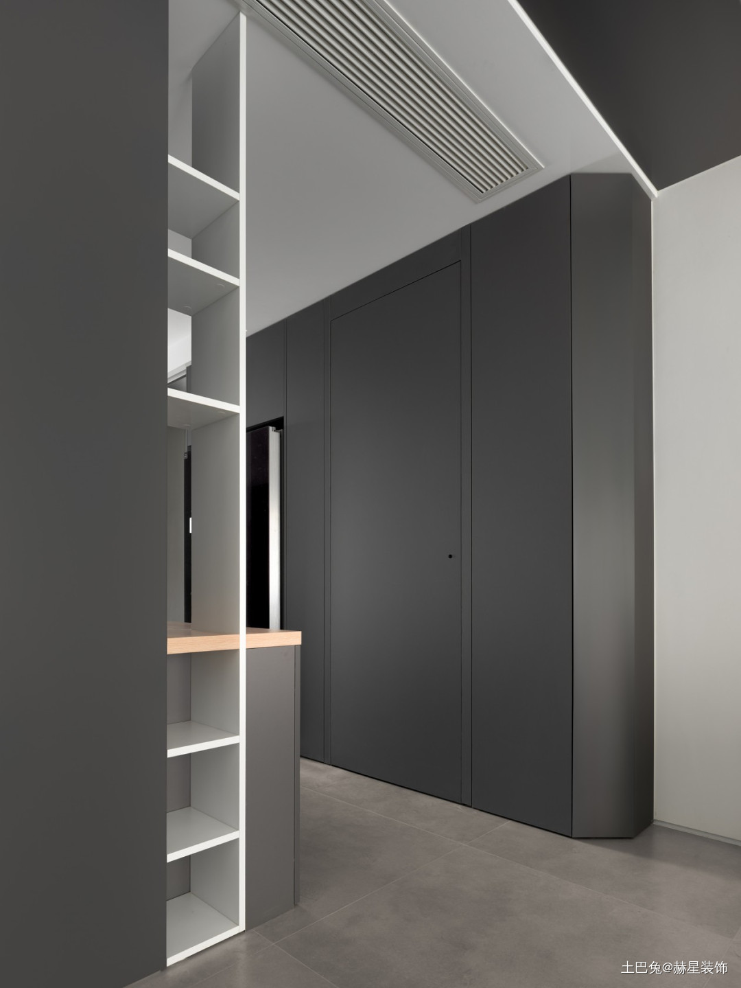 另一侧是开放格,一边深色高柜储物柜