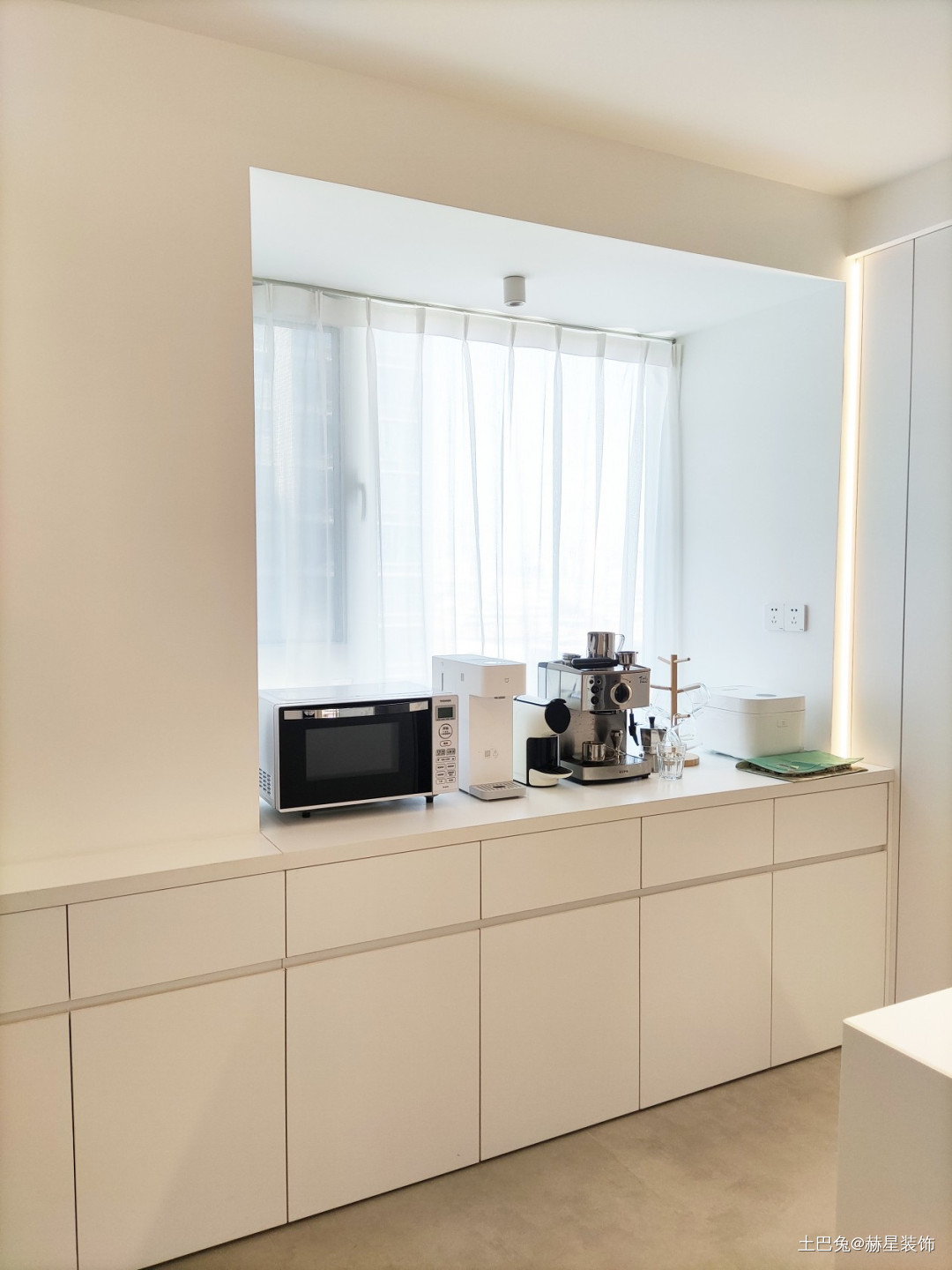 餐厅电器放置柜:柜子在厨房门口,用了原本的飘窗,改造成了橱柜,用来放置厨房内放不下的电器,也是一个大大的餐边柜