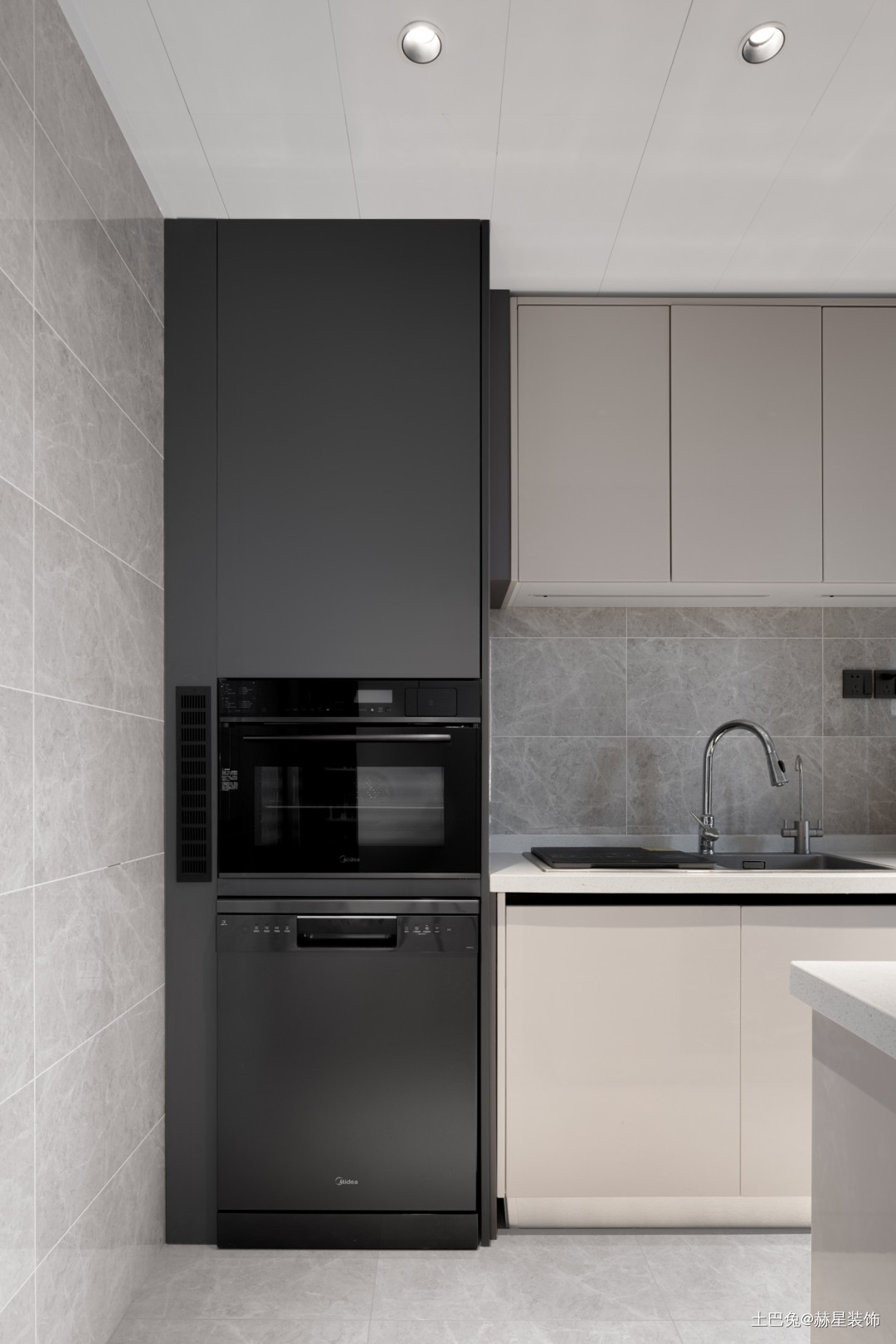 厨房一排到顶电器柜,灰色墙砖搭配米色橱柜柜体。