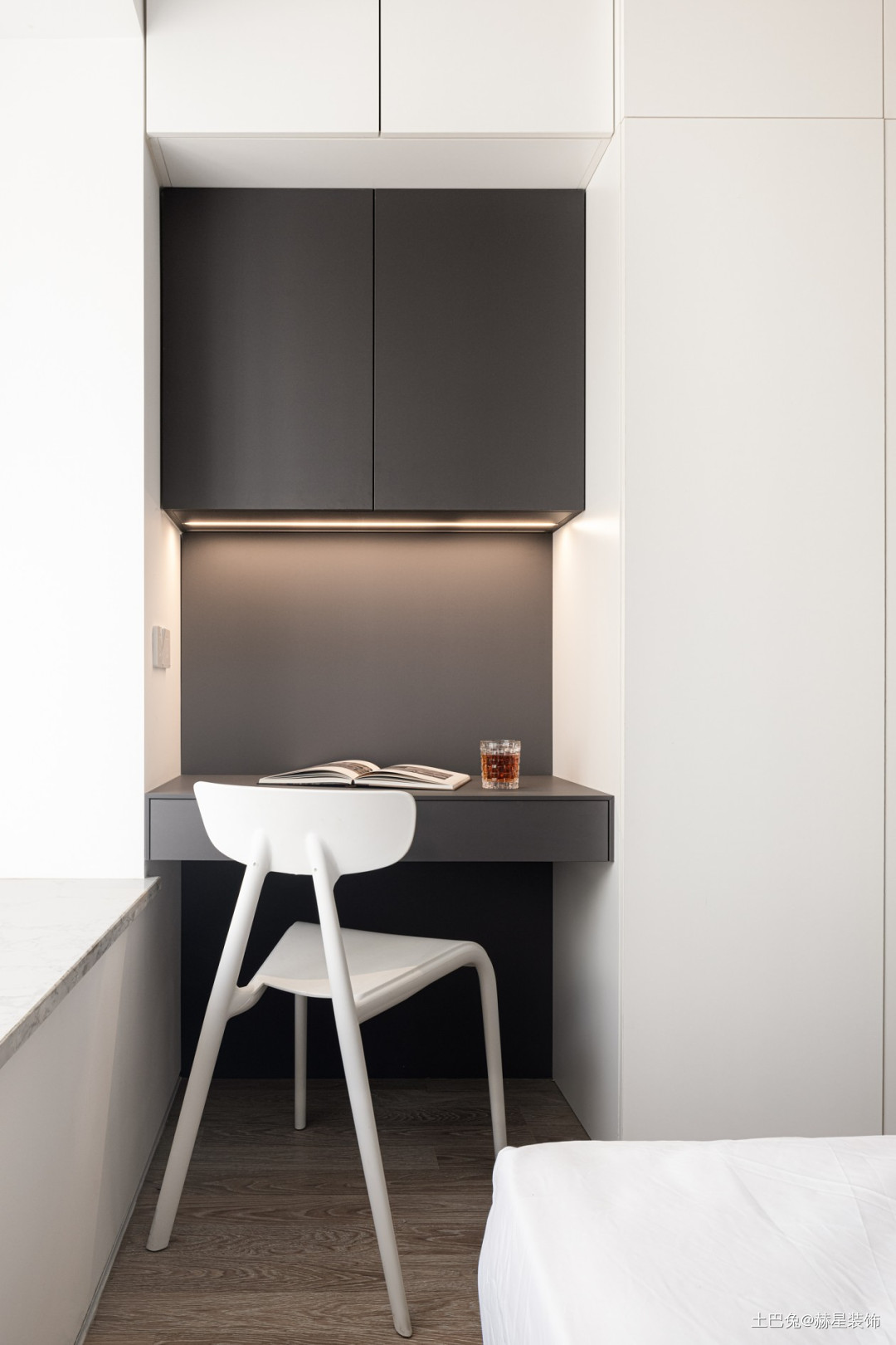 因为衣柜是深柜(深度60CM),梳妆台上部吊柜,为了防止碰头,如,做了两个厚度