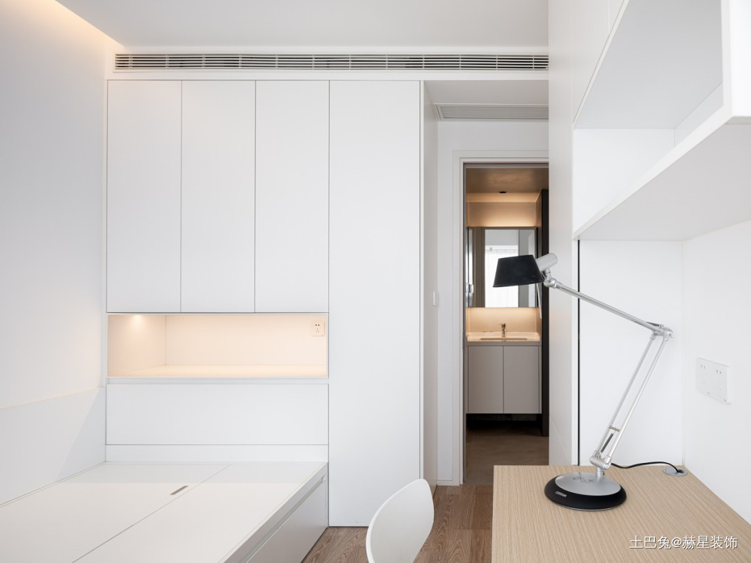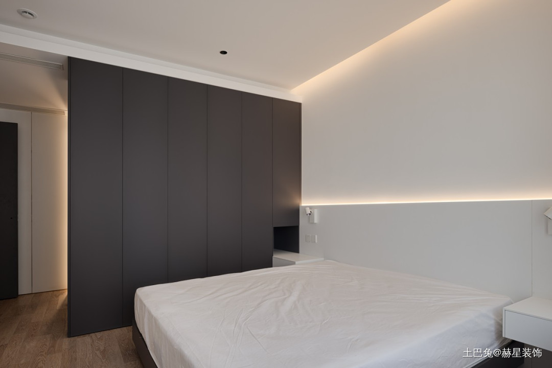 主卧室较大,原来有衣帽间,通过户型优劣分析,和业主沟通后衣帽间较为多余,在设计中直接拆除,取消了衣帽间。做了一整排大衣柜,储物足以。