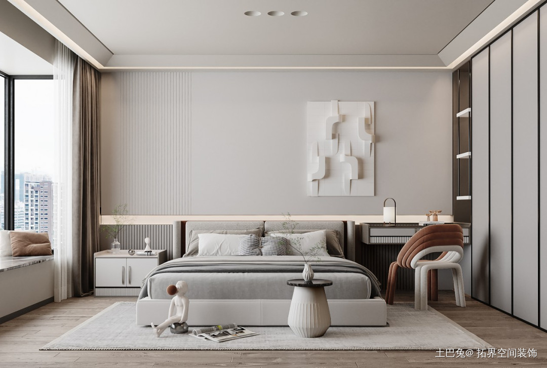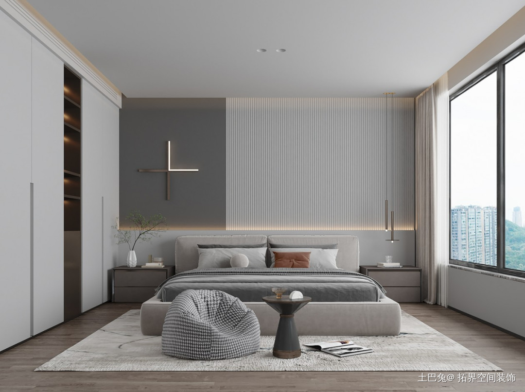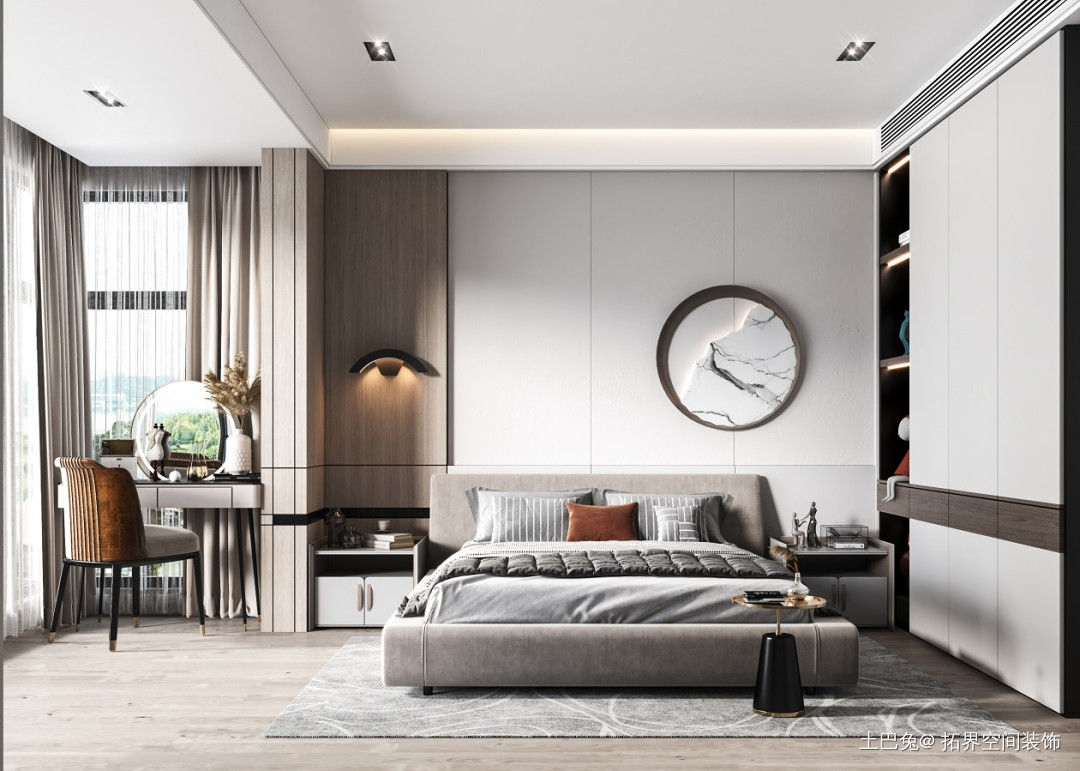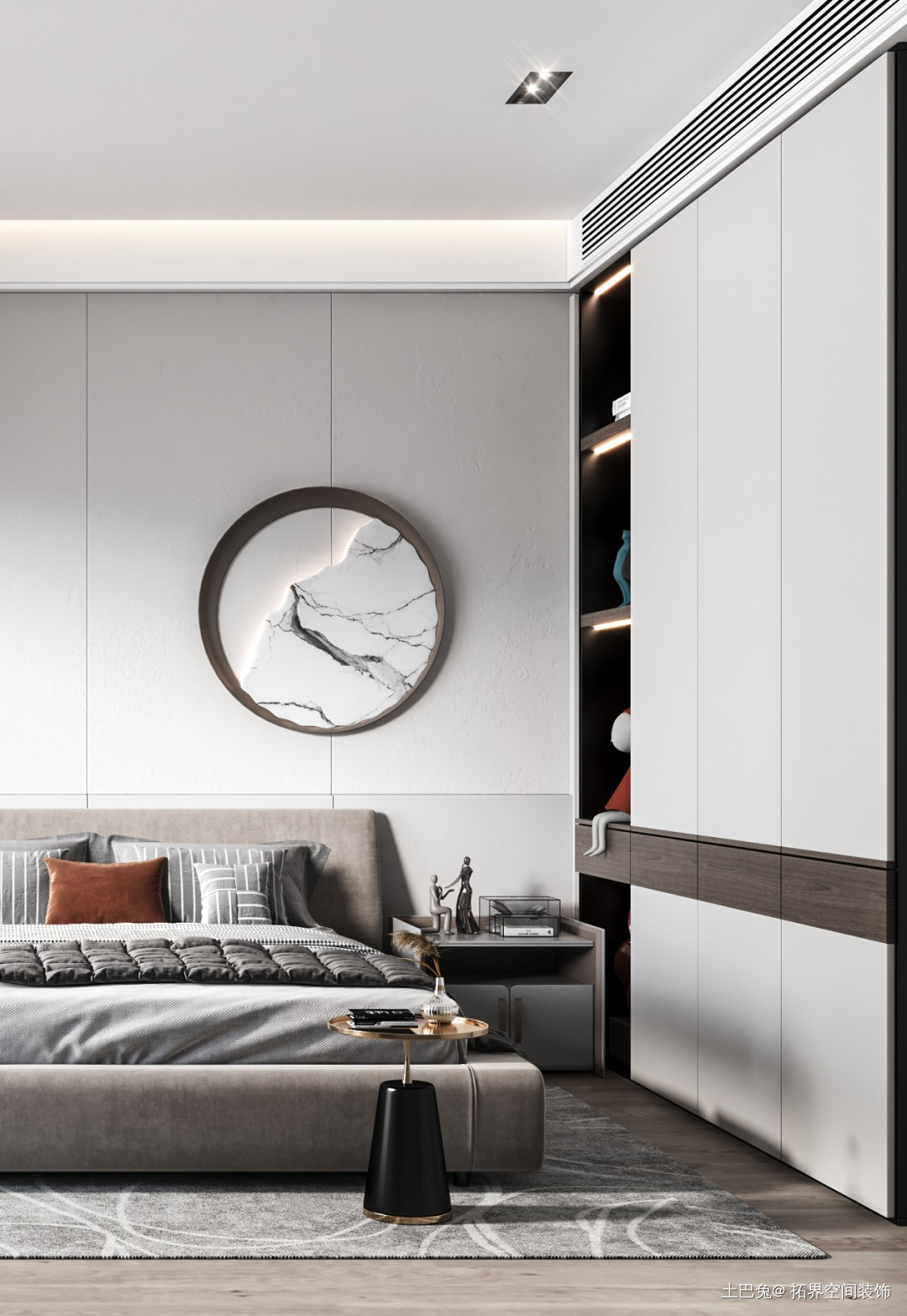 卧室富有小资情调,整排的衣柜,衣服再多也不怕没处放。