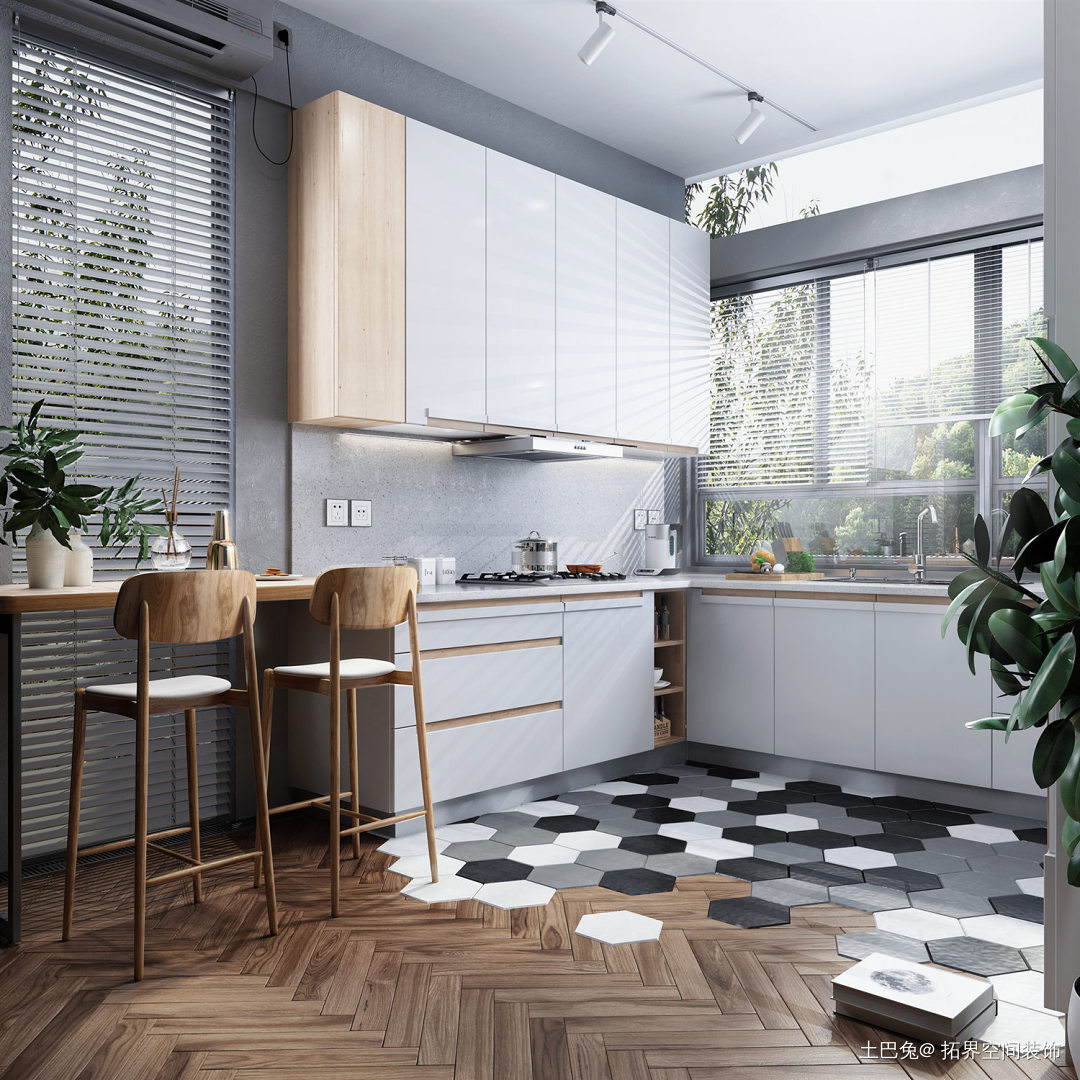 餐厅和厨房靠在一起,餐厅是吧台结构。