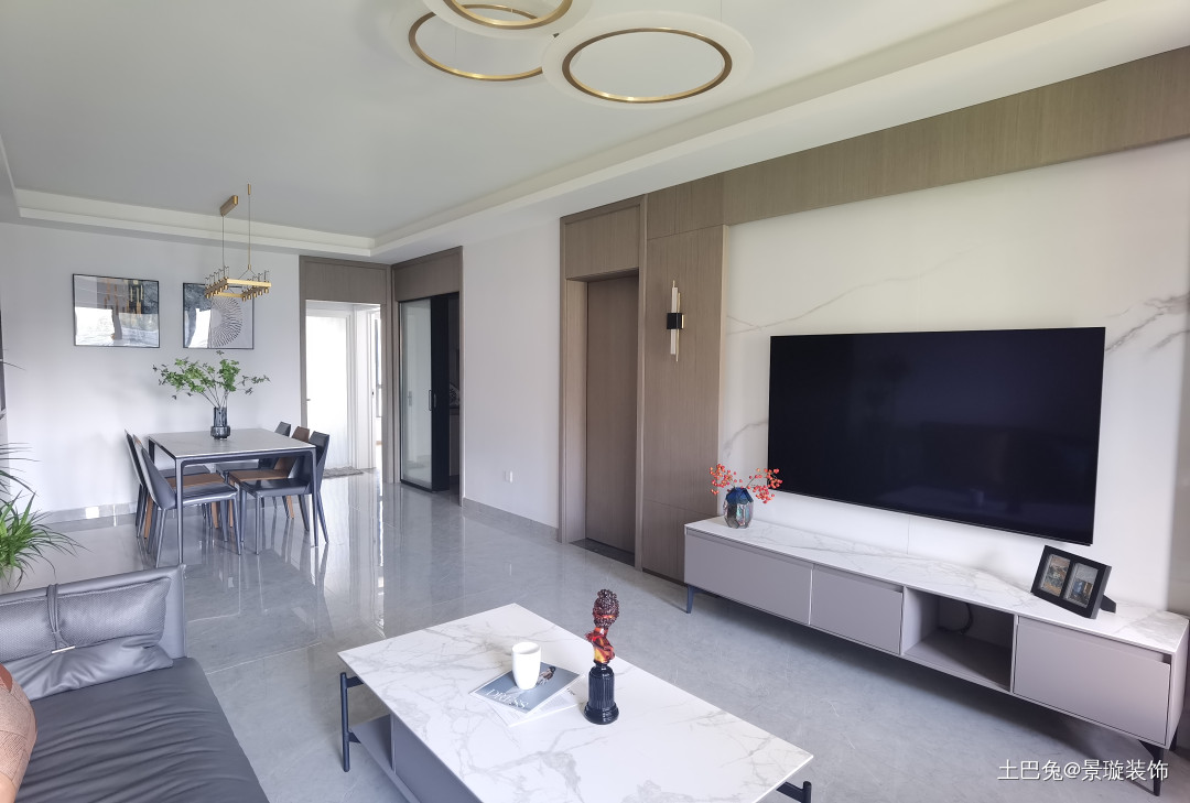 原有的电视背景空间比较传统和保守,设计后主卧室门的材质与电视背景墙护墙板的材质相同,延伸了电视背景的纵深感。电视背景墙的护墙板采用抽缝的手法,增加了客厅背景的层次感。