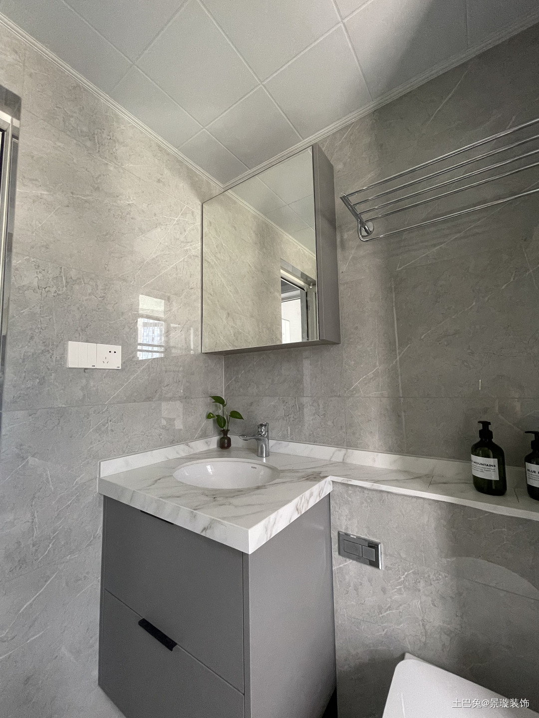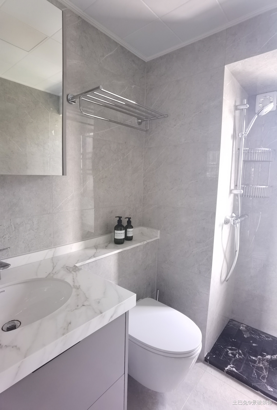 卫生间的浴室柜台面延伸到马桶水箱上方,增加和延伸了台面的使用功能。