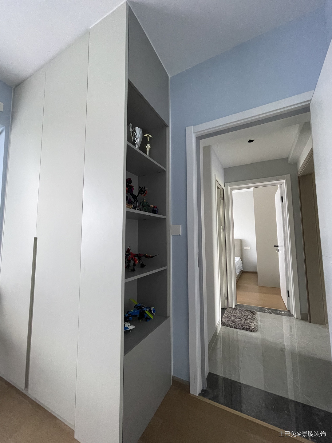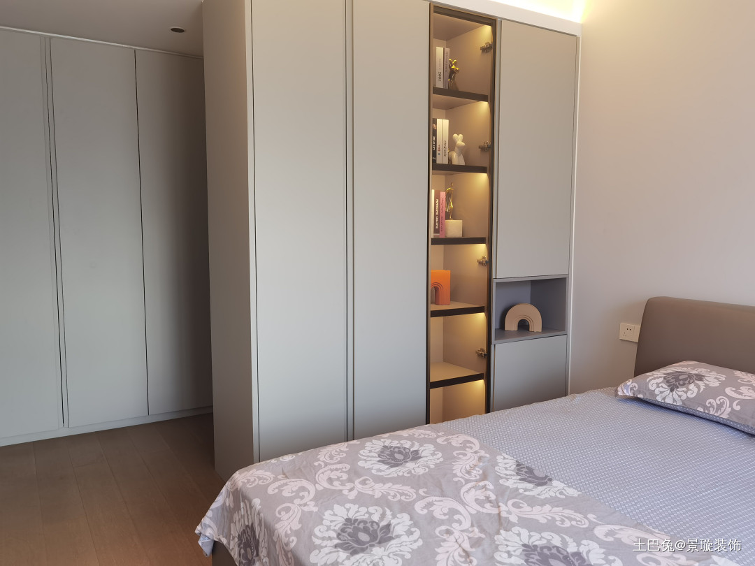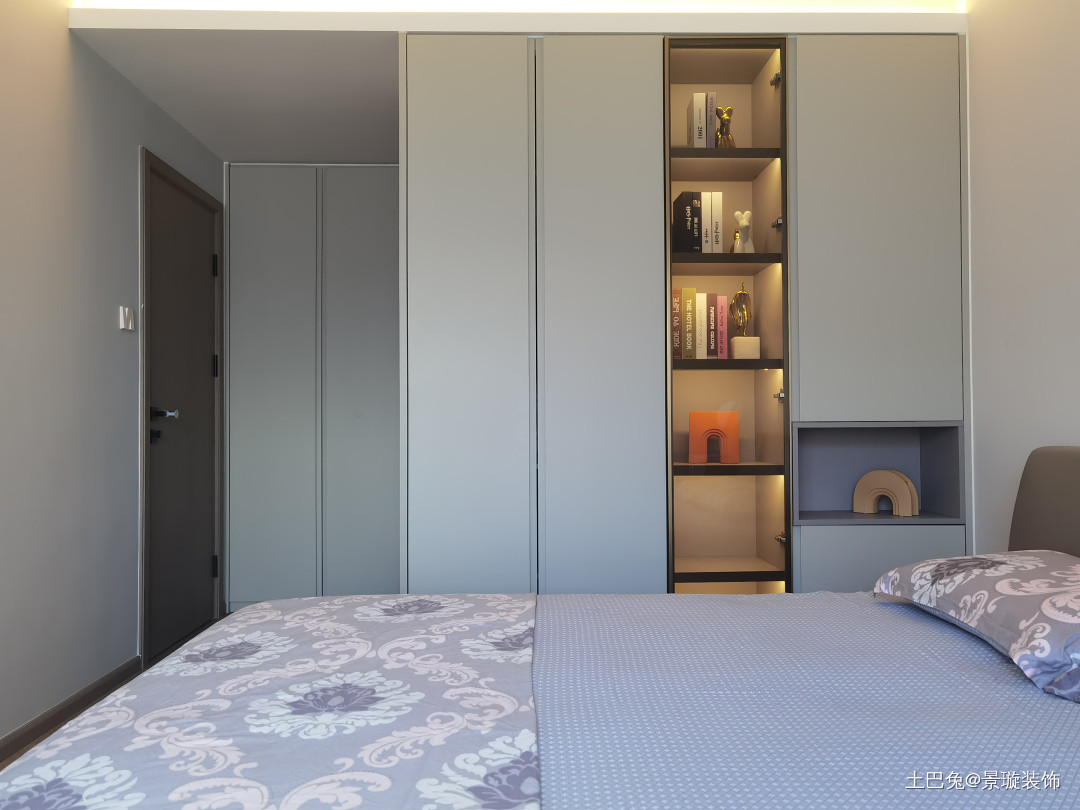 开放式衣帽间在视觉上拉大空间面积,朝卧室的一面衣柜兼具隔断、收纳和美观的功能。