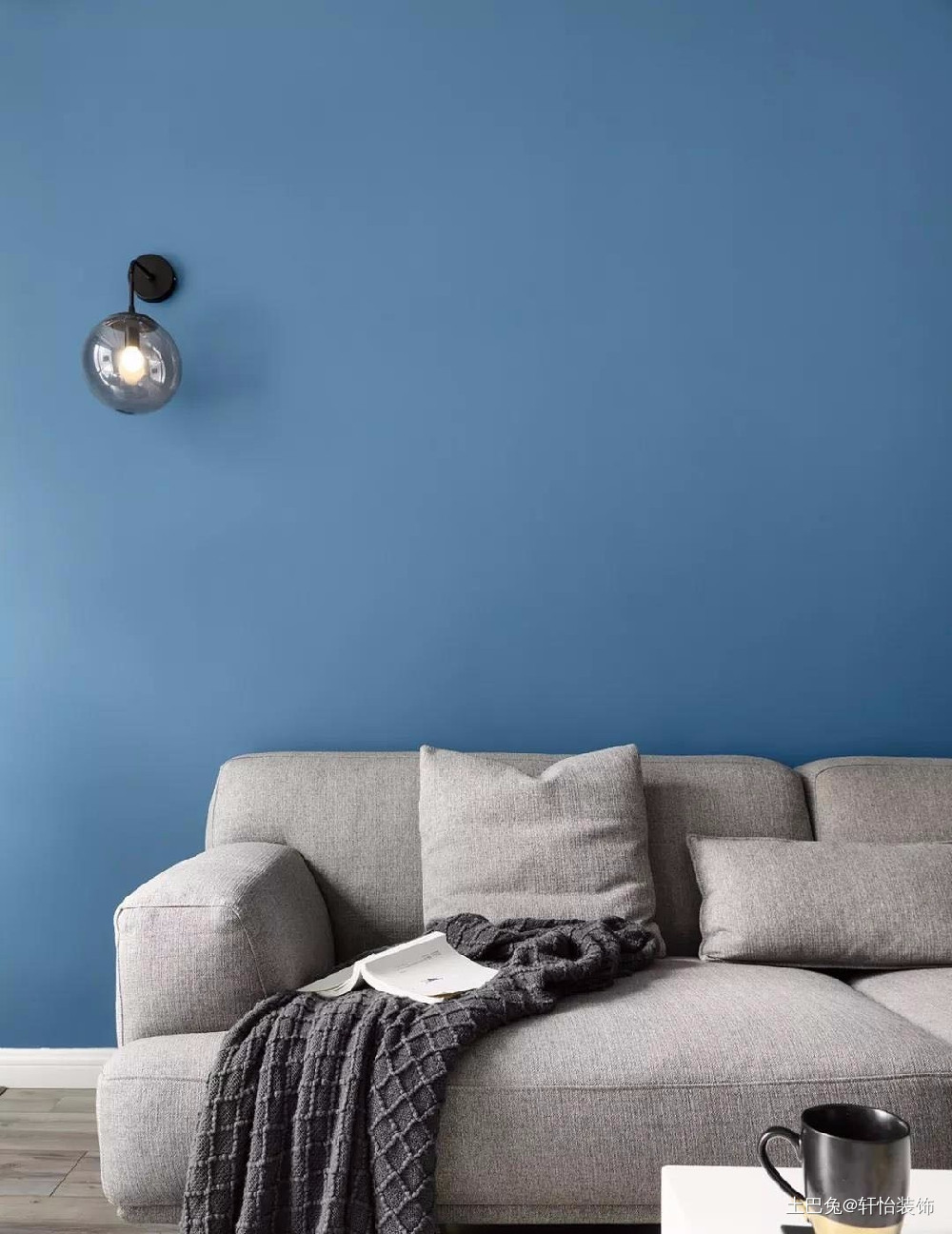高饱和度的蓝色背景墙搭配灰色沙发,沉稳与跳跃的色彩相互衬托