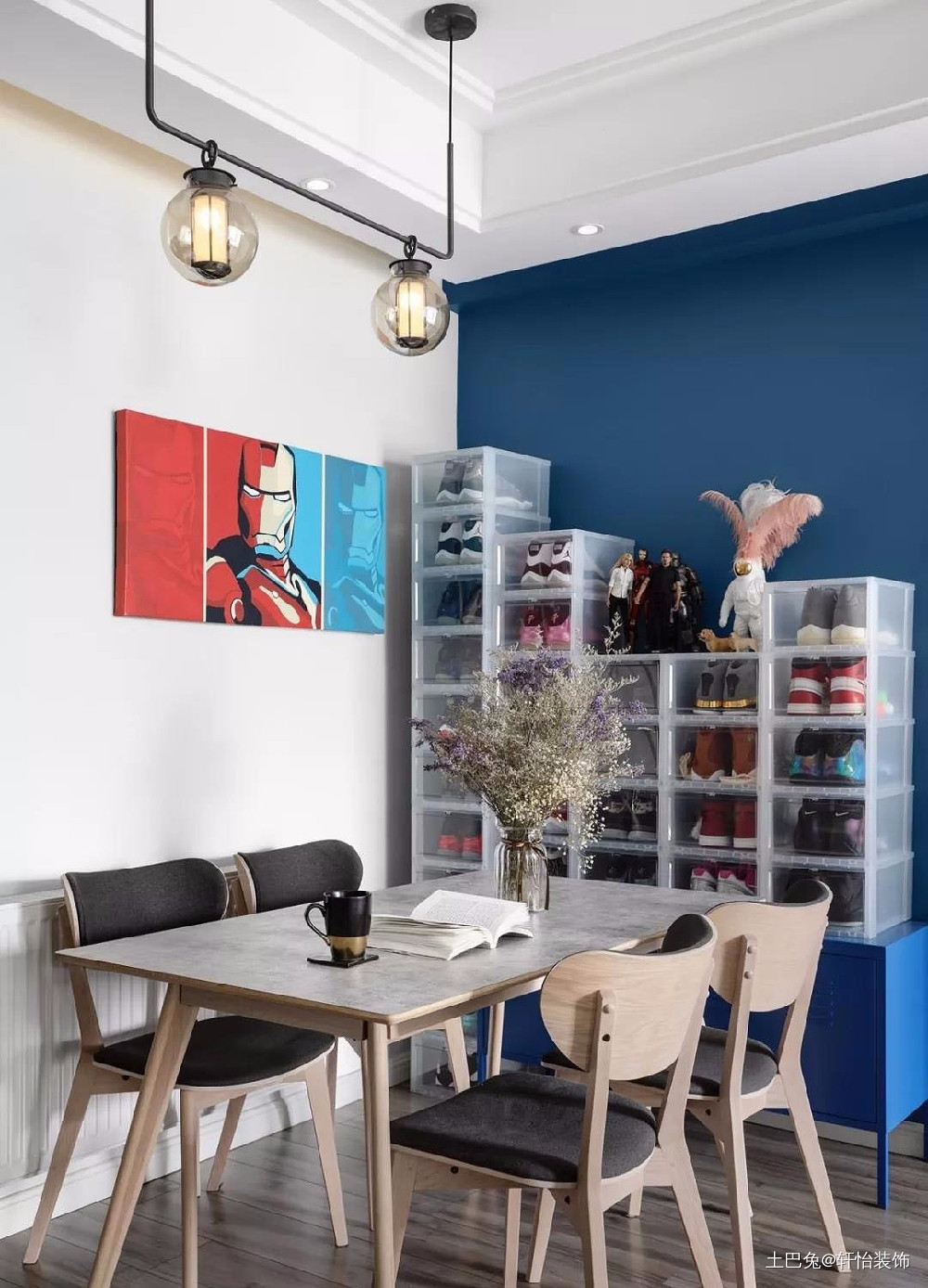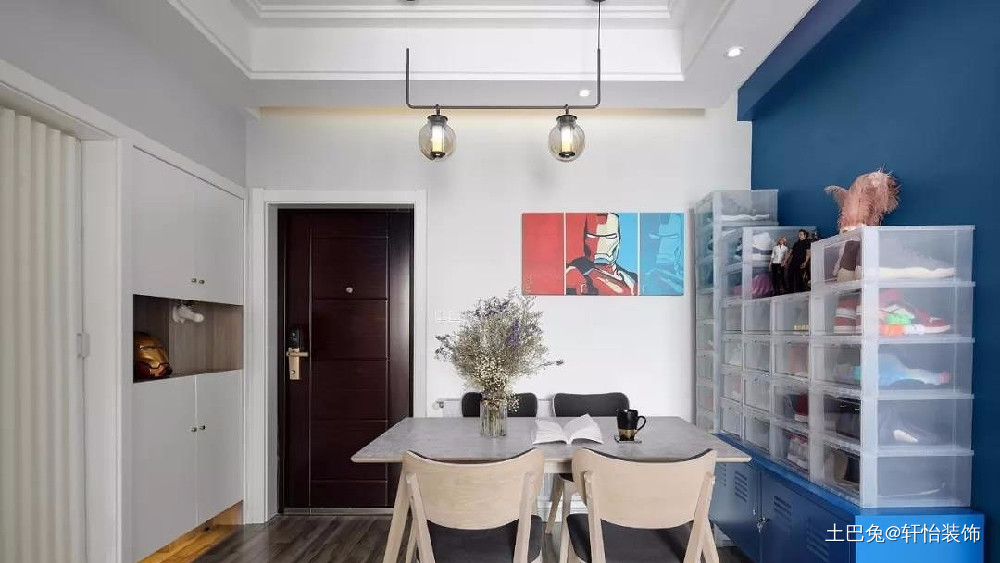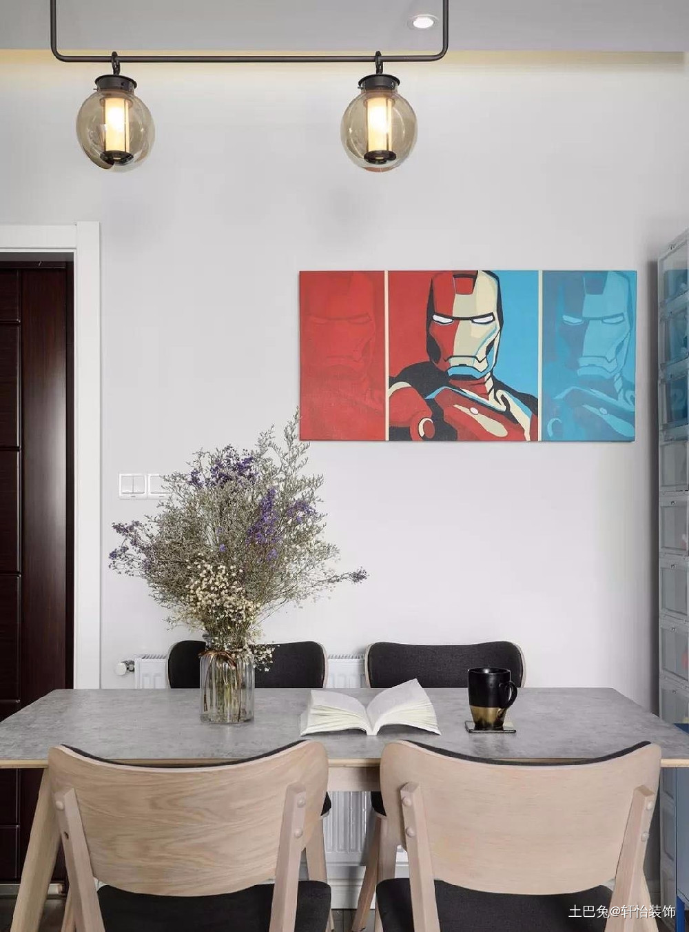 餐厅留白墙面用钢铁侠挂画点缀,咖色暖光吊灯增添就餐氛围