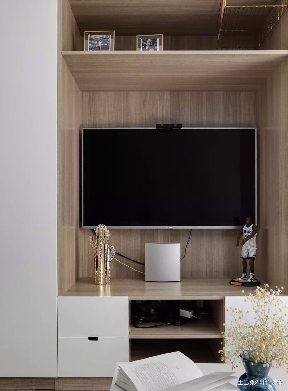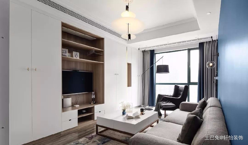 客厅纳入阳台,定制整面电视墙组合柜体,地面延续餐厅地板,简约顶面用白色暖光吊灯点缀