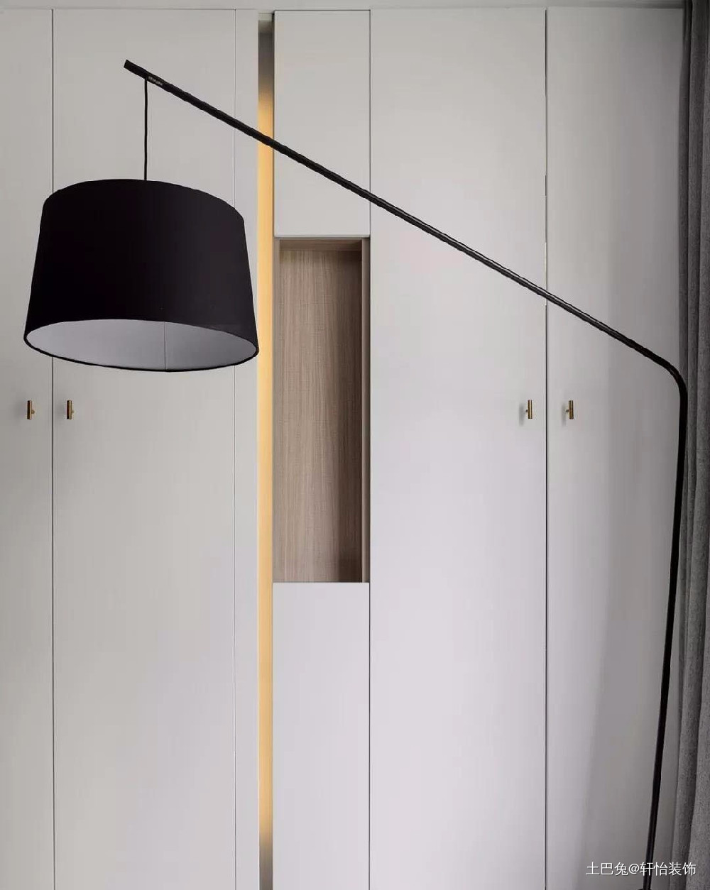 灯带右侧柜体内放置洗衣机与洗涤用品,黄铜柜门拉手搭配黑色钓鱼落地灯,设计感十足
