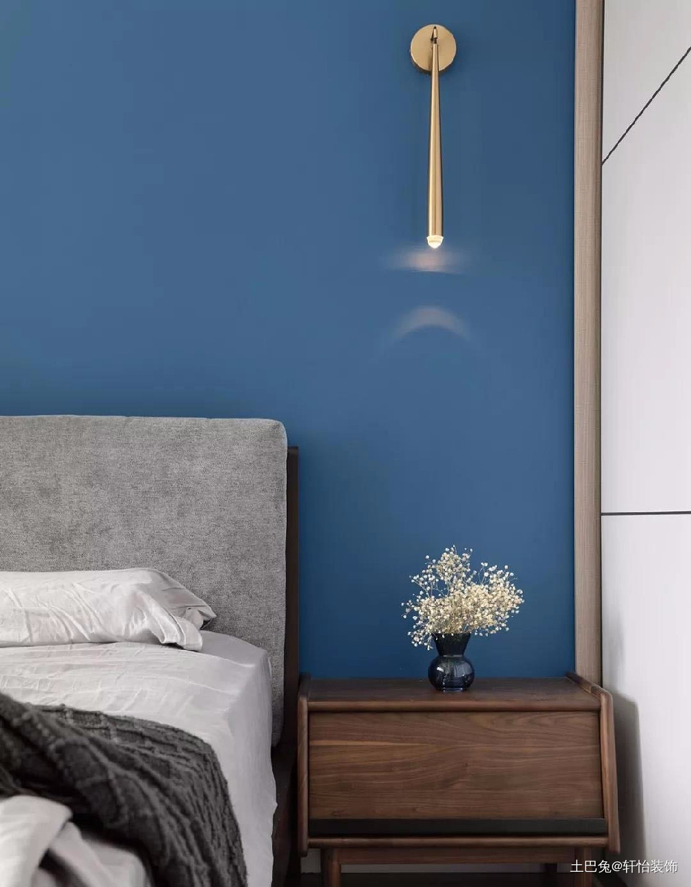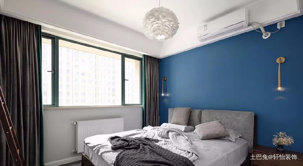 主卧以蓝灰色为背景,深色木纹地板加铺大张灰色地毯,极简顶面用白色羽毛灯点缀