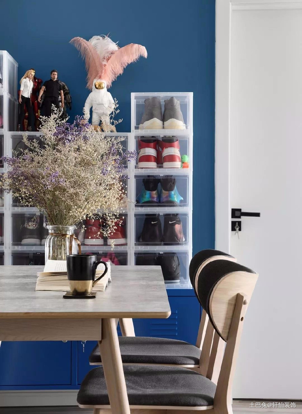 蓝色装饰柜上用透明收纳盒将AJ球鞋装起来砌一堵墙,展示和收纳同时满足