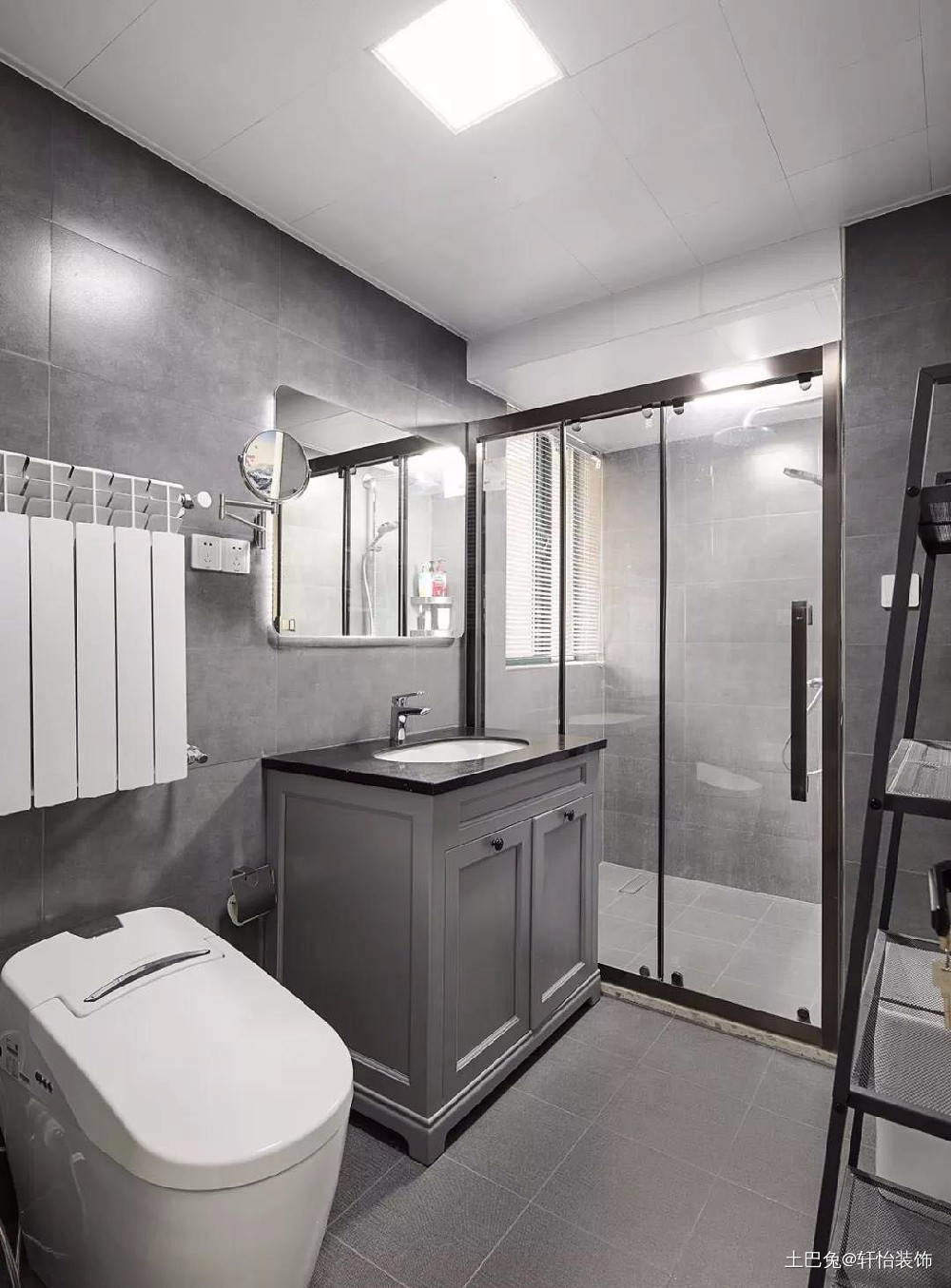 卫生间地面与墙面通铺灰色瓷砖,用玻璃移门做淋浴隔断,方便实用