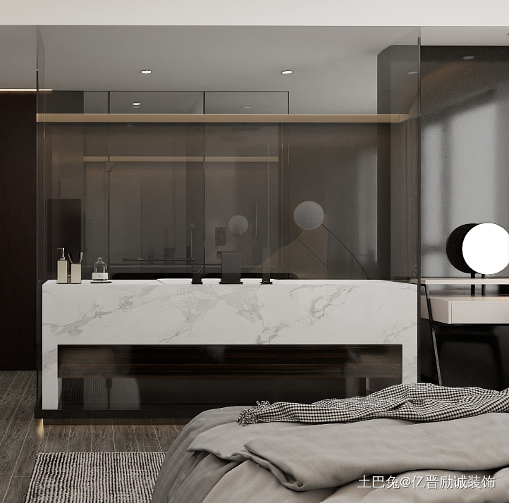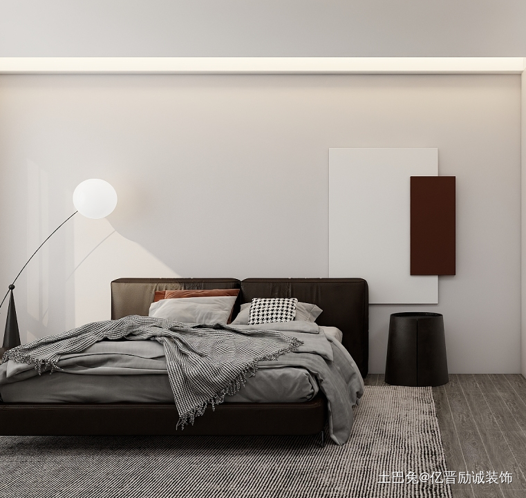 主卧,延续整体黑白灰的颜色和质感,同时在更小的空间让灯光层次丰富而不炫目,木地板和白色肌理的墙面让简单的颜色拥有丰富的内容