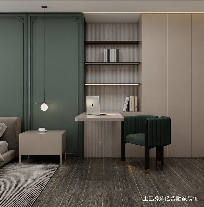 孩房以蓝绿色调为主,搭配白色简洁吊顶,整体清新感倍增,墙面拼合的方式,功能更加丰富