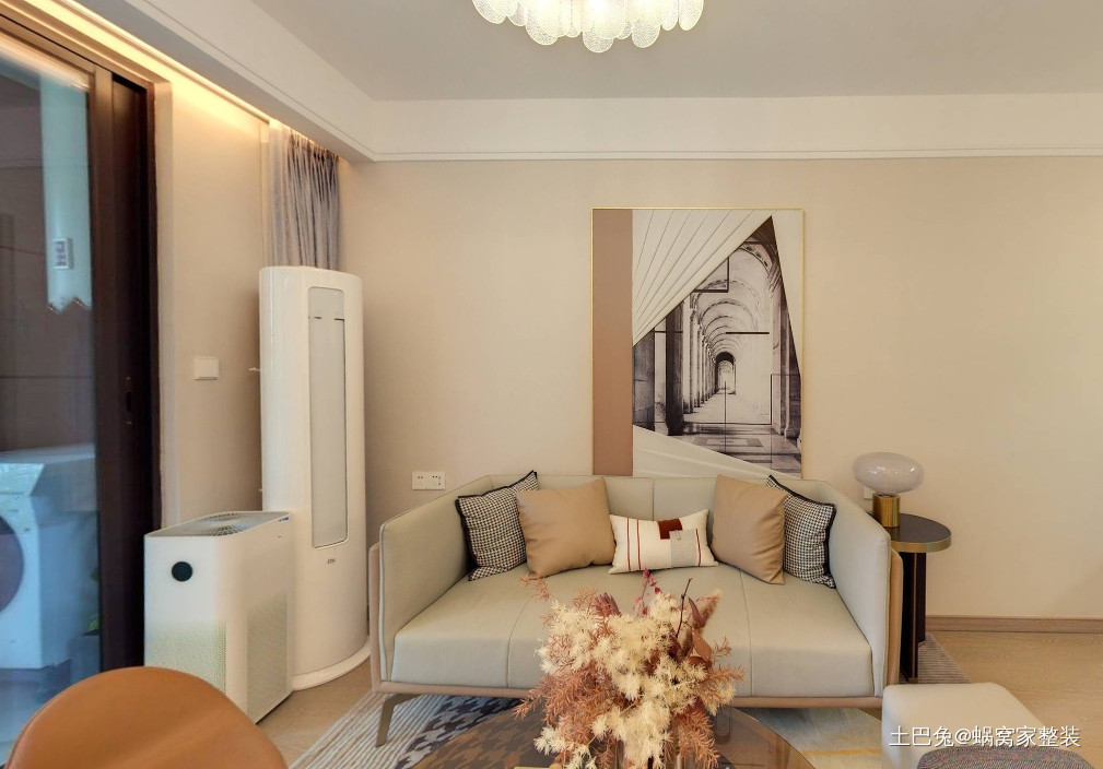 不论是家具,家电还是配饰的颜色,都紧紧围绕黑白棕三个色系。例如白色的空调,棕色的靠枕以及黑色的茶几等,让整个空间的完整性和协调性更强,视觉效果更好。