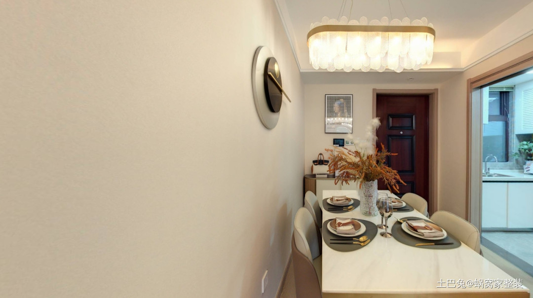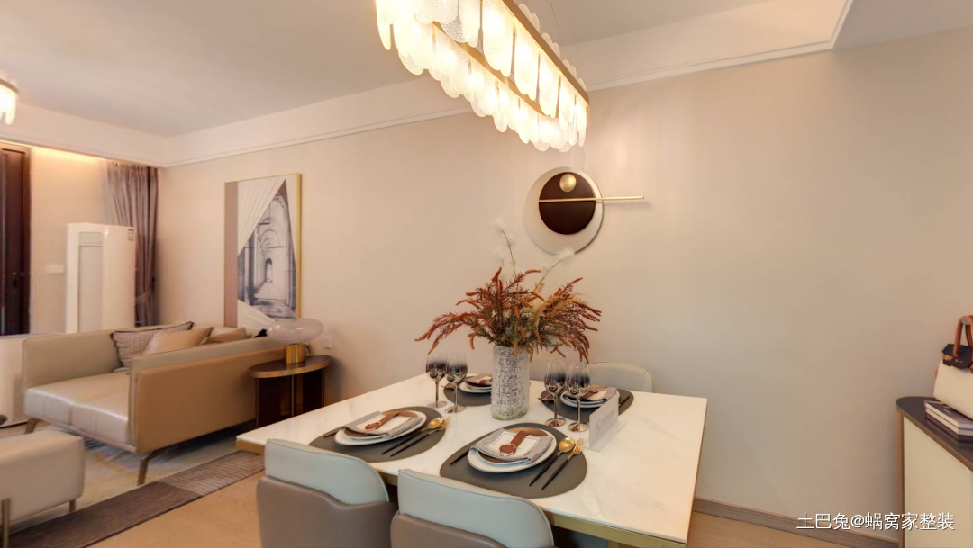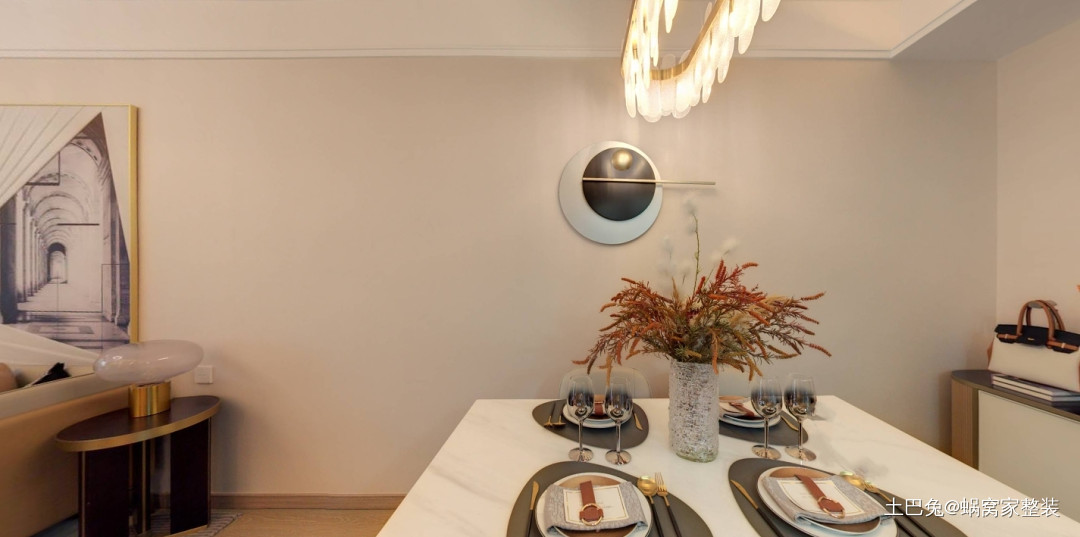餐桌上方有一个造型丰富的吊灯,像一个发光的水母,也像柔软的云,高高的悬挂在半空中,柔和的灯光照亮整个饭桌,升华整个空间格调。