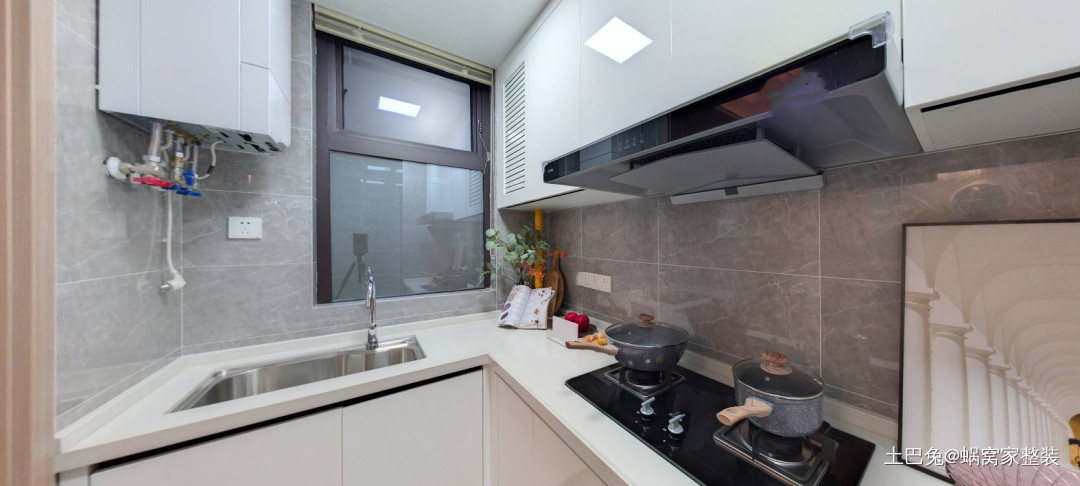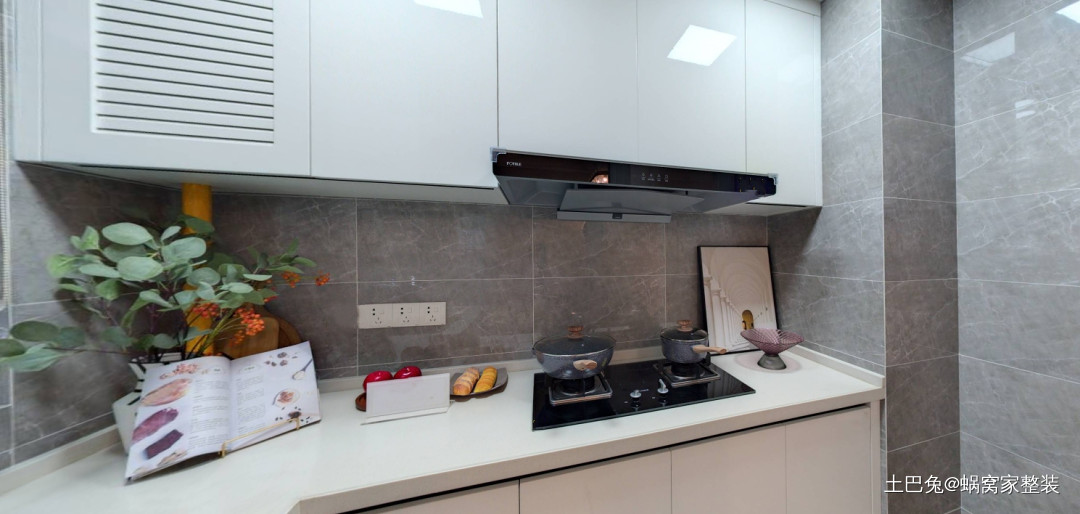 厨房L型灶台设计,像珍珠一样带有光泽的白色营造一个干净明朗的空间,设计师巧妙利用转角设计增大空间的可使用性,还将洗菜区和烹饪区划分开,使用起来更方便。