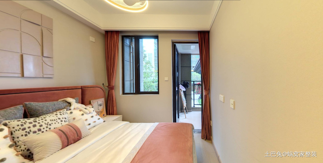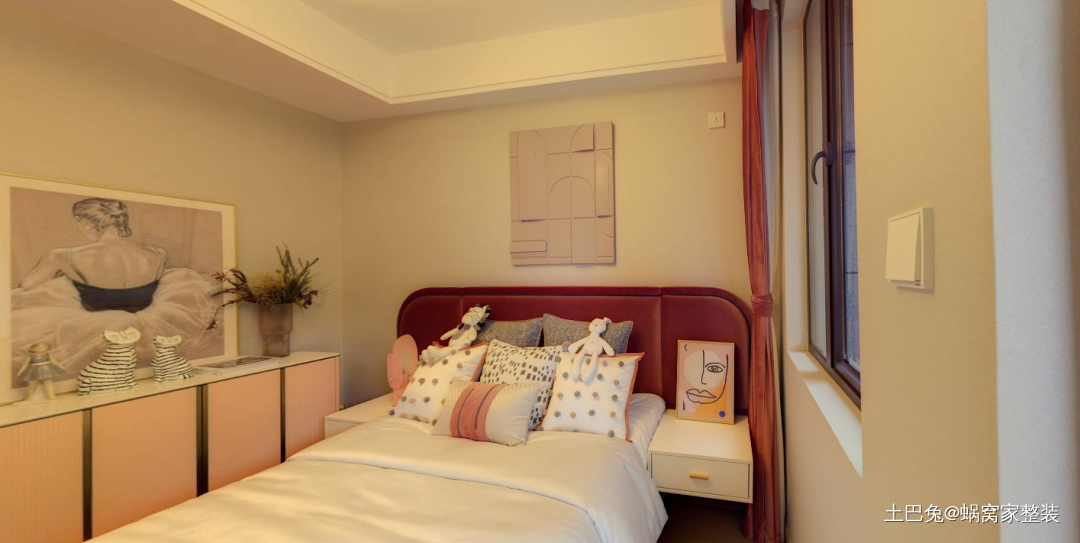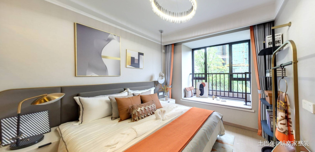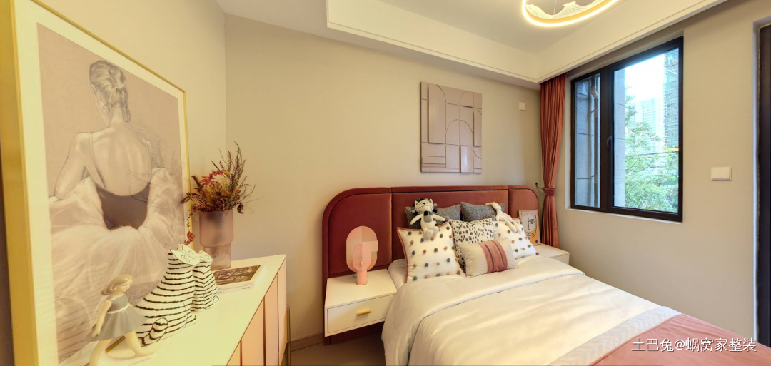 次卧的布局延伸整个空间的格调,定制的悬空床头柜贴合床,让空间布局更加合理;搭配暖灯的设计,整个空间尽显温馨~~
