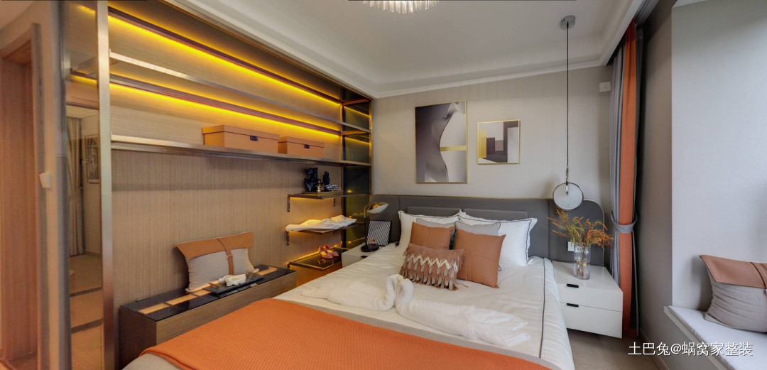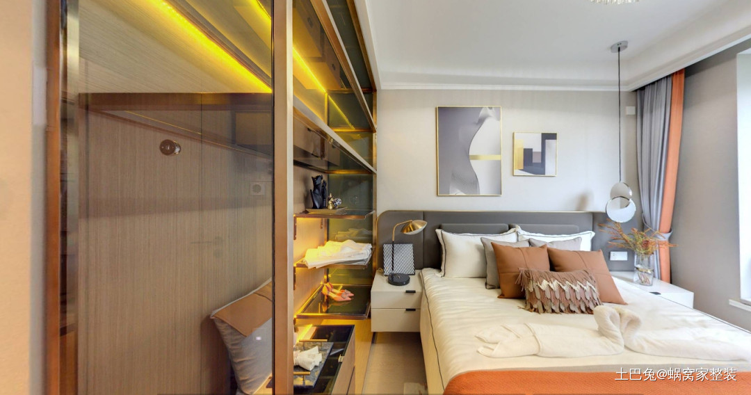 在床的一侧设计在与墙面同面积的置物架,金属质感的边框,暖色的灯带,给人一种高级轻奢的氛围感,在功能上可以收纳各种包包帽子等东西,视觉上又给人一种展品架特有的美感,彰显业主的精致。