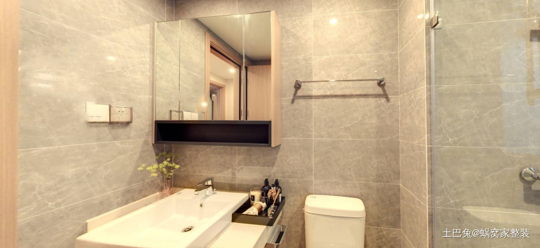 整个空间的灯光温馨且充足,设计师还专门设计了带有一层木格架的镜柜,给人提供随手放小物件或配饰的空间,实用性更强。