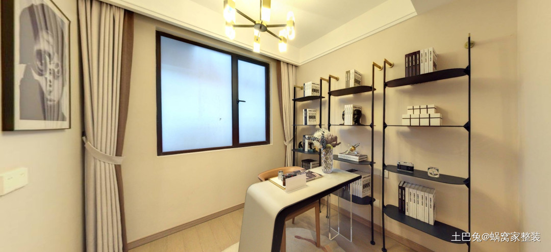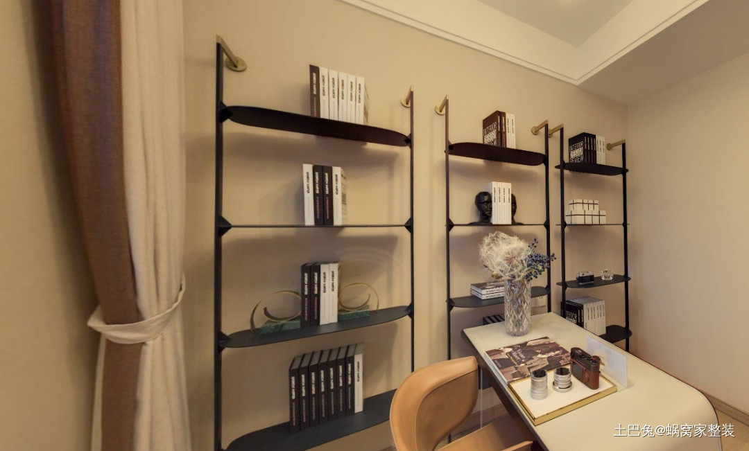 合理的书房规划总是让人有种向往,因此书房采用去繁从简的设计,整齐的3联排铁架布局,能很好的摆荡+展示书籍,更让书房多一种宁静感~