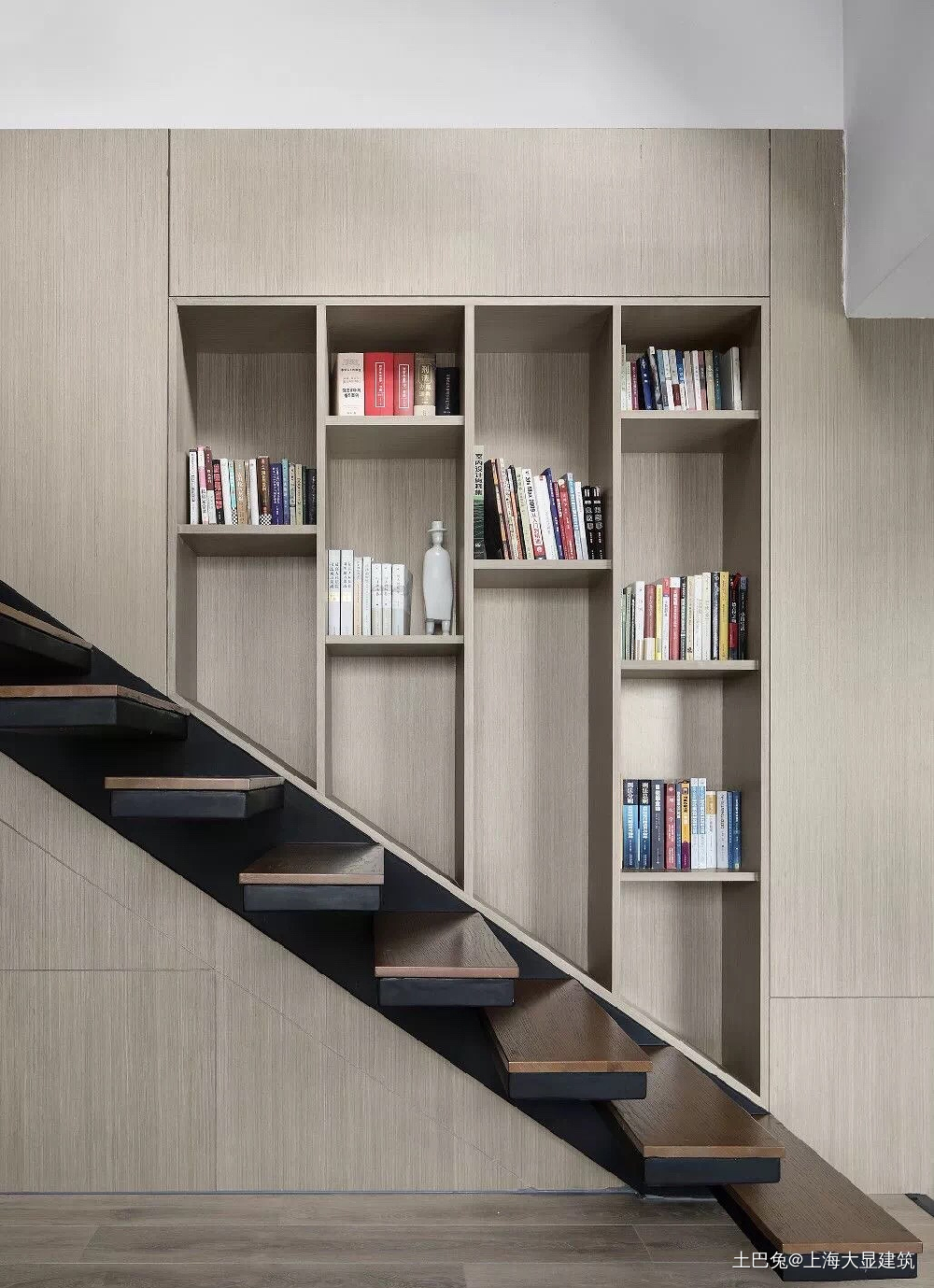 作为客厅的延续空间,转角的休闲区时尚感可能更胜一筹。入墙式悬空楼梯缓缓上升,随着光影递进,强烈的线条感冲击着视觉神经,极具现代和艺术格调。将都市精英人群的精致气质与设计相融合,营造一种慢生活形态