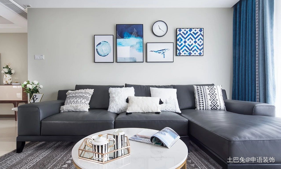 客厅通铺暖咖色地砖,墙面选择了浅灰色,顶面是纯净的白色,整体硬装色调优雅柔和。软装以蓝色为主,有种宁静幽怨的意境。