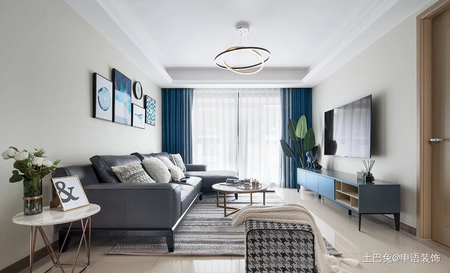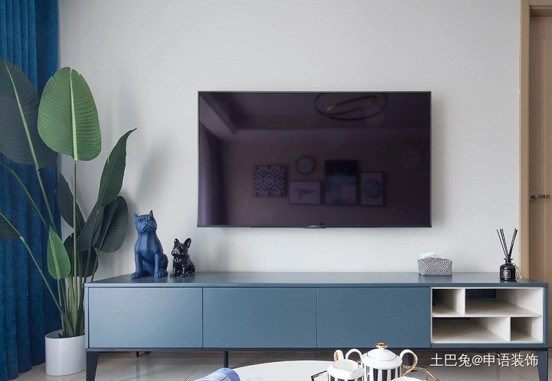 灰蓝色的电视柜保证了软装格调的一致性。电视墙留白,通过电视柜旁边充满生机的绿植打破大白墙的单调。