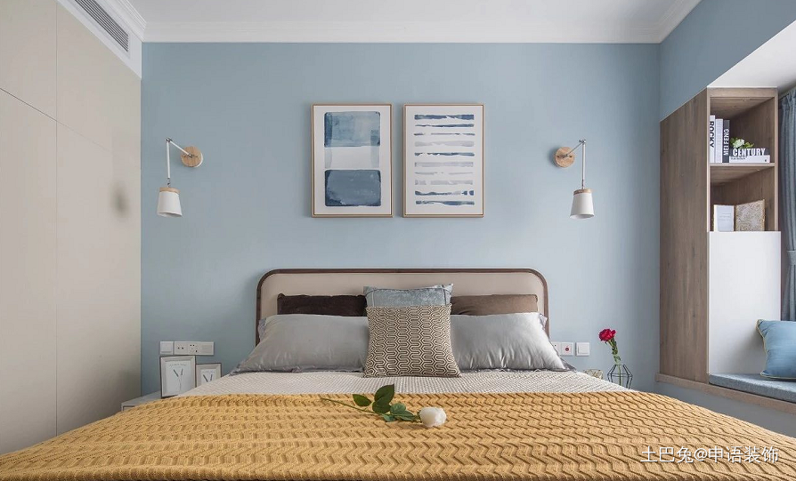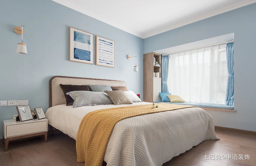 背景色是淡蓝色,饱和度低,亮度高,是常被用于卧室背景的色彩,容易营造出舒缓宁静的睡眠环境。