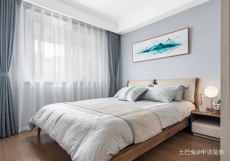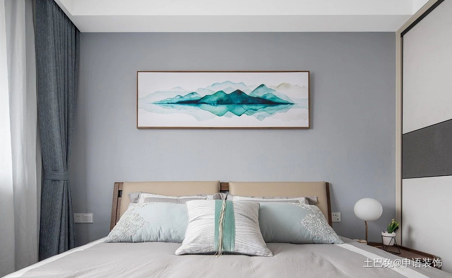 父母房的风格有点新中式的韵味,优雅素净的空间中,一幅蓝绿色的木框装饰画让空间顿生古朴典雅意境。