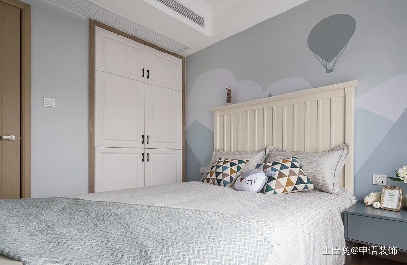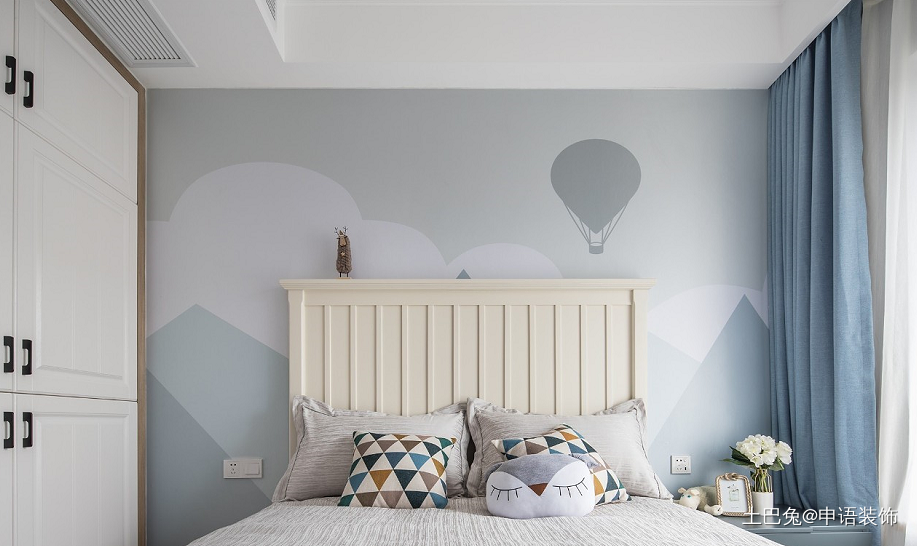 儿童房与主卧色调一致,但床头背景选择的是一幅蓝、灰色调壁画,宁静柔和的空间,也不失童真童趣。