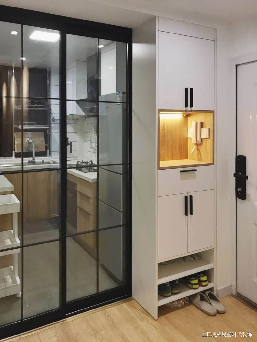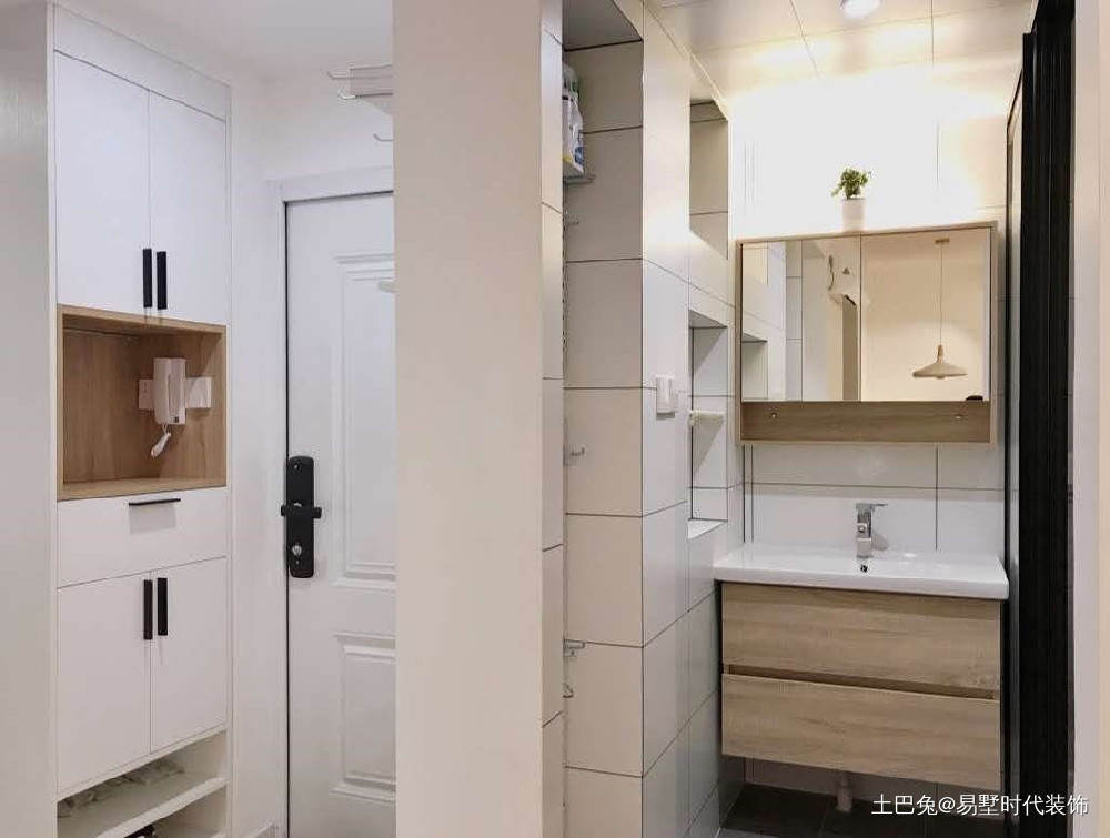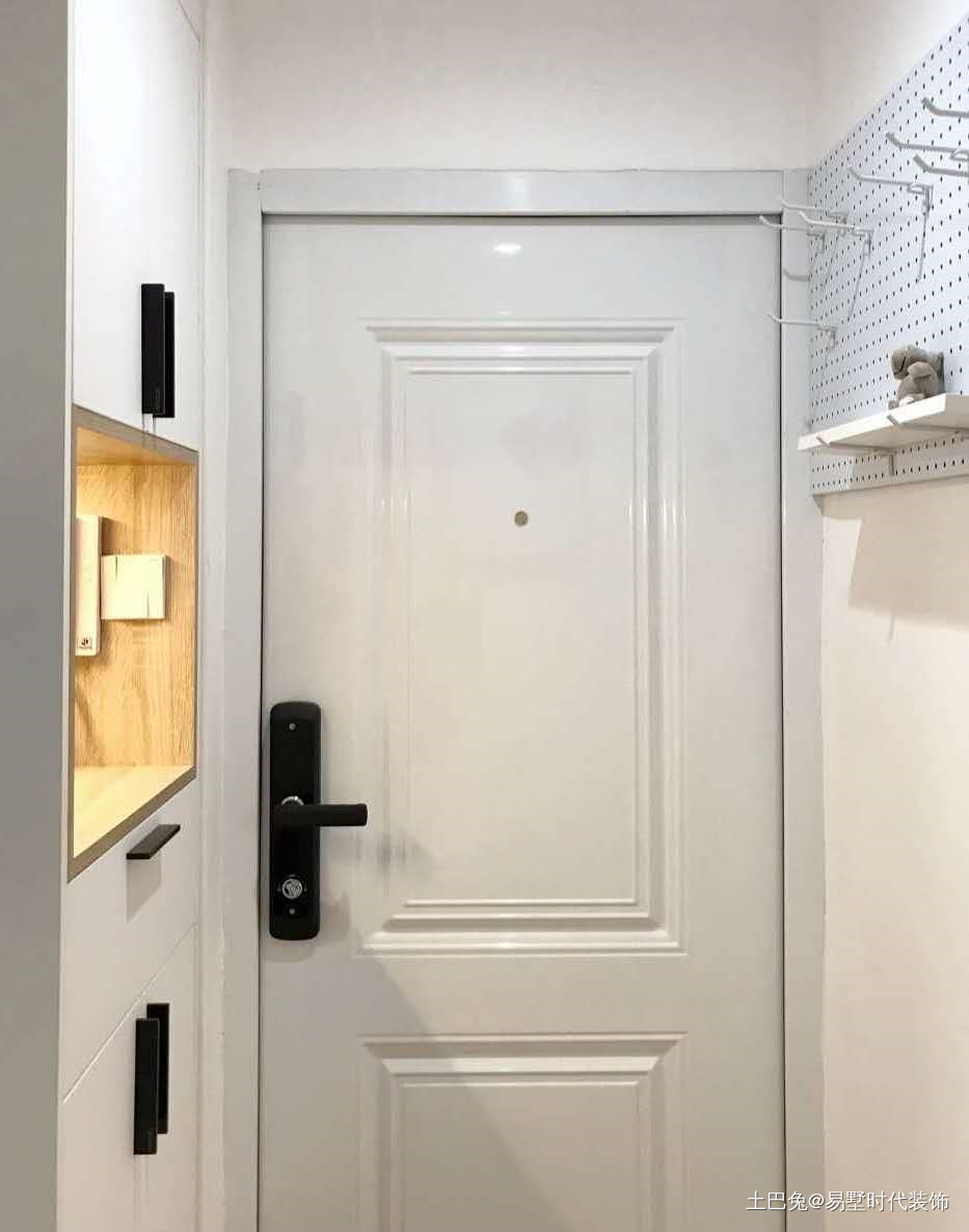 入户门处墙体,悬挂超薄鞋柜,鞋柜是翻盖形式的,厚度只有15厘米,不占过道空间。树枝衣架,雨伞包包随身穿的衣服可以随意挂在衣架上,很是方便。 鞋柜采用悬挂方式,挂于墙面,下面留出10公分的高度,可以放一些随时穿的拖鞋。门口留了电源,安装监控,可以保证家居安全问题。