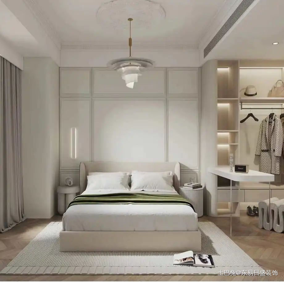 卧室融入了法式的设计手法,使简单的现代加入了浪漫生活情调。融入了阅读,衣帽间和睡觉的三个功能。达到一个安静舒适的就寝环境。