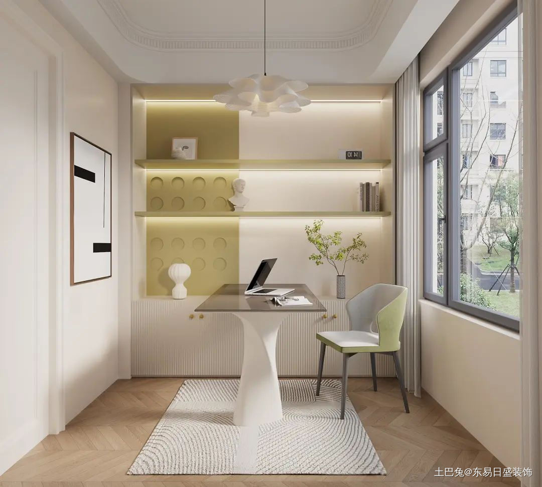 本是一个狭窄的空间,进行了重新规划,成为了一个独立式的书房,安静的阅读环境。融入绿色调,更有生机活力的氛围感。