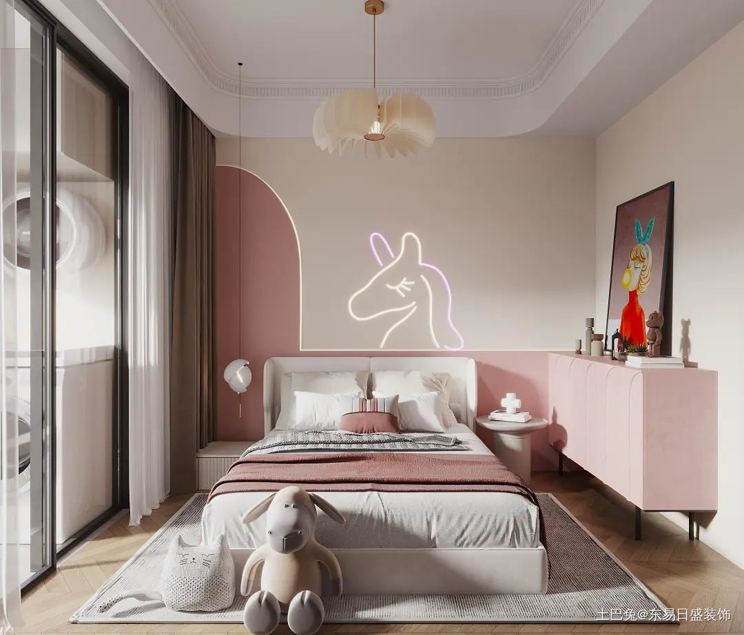 一个五岁小女孩的卧室,可爱,浪漫,清新。注入了适合女孩的不同的粉色系色调为主,整个空间公主风而不闷、俗。床头灯融入小朋友最喜欢的动物形式,特别具有主人的个性主张。